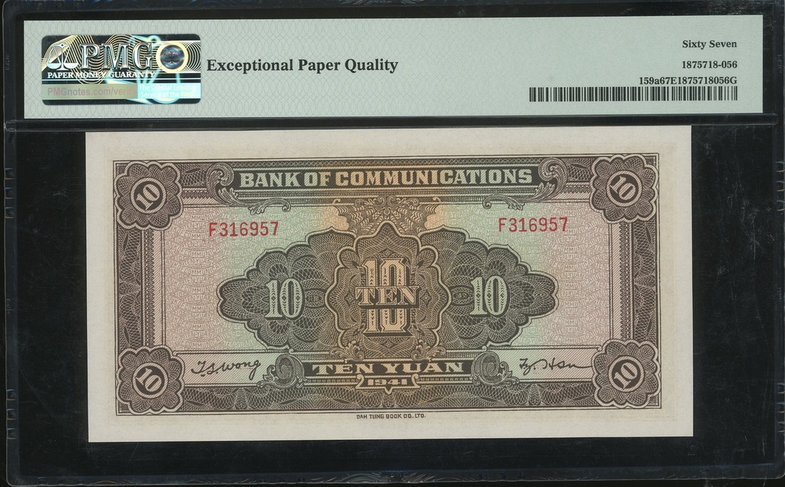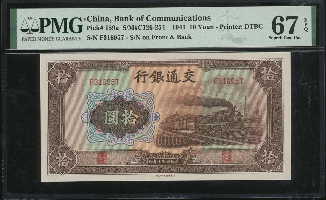 Bank of Communciations, 10 yuan, Year 30(1941), serial number F316957, (Pick 159a), PMG 67EPQ Superb Gem Uncirculated .