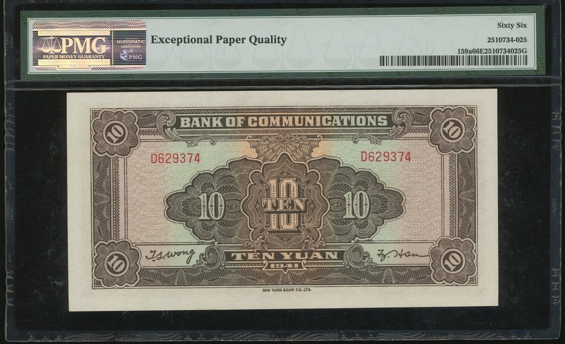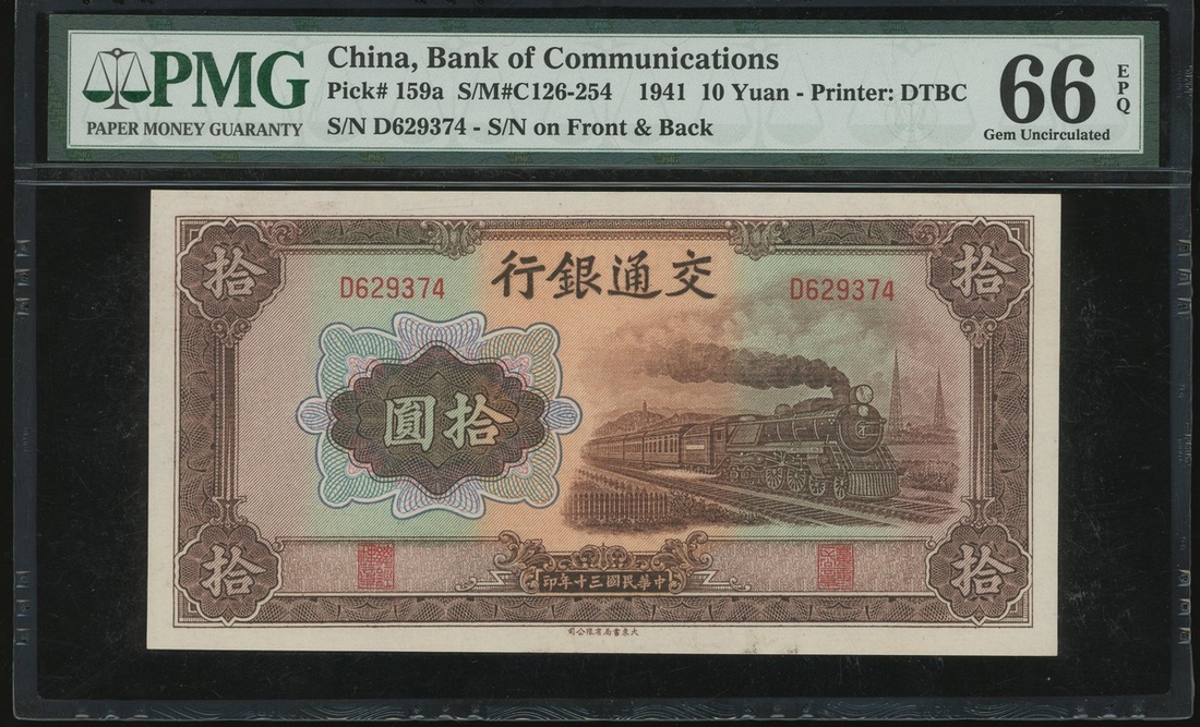 Bank of Communciations, 10 yuan, Year 31(1941), serial number D629374, (Pick 159a), PMG 66EPQ Gem Uncirculated, lovely high grade.
