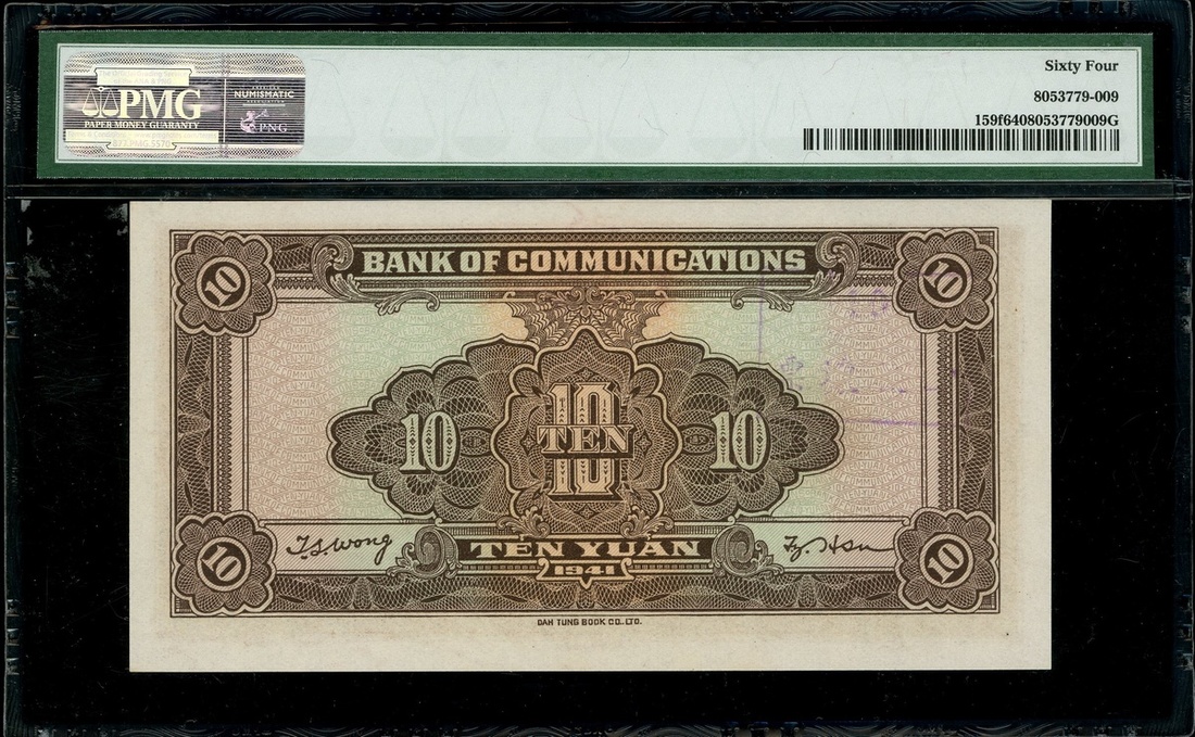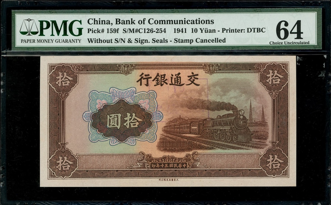 Bank of Communications, 10 Yuan, 1941, without serials and signatures, stamp cancelled, (Pick 159f), PMG 64 Choice Uncirculated