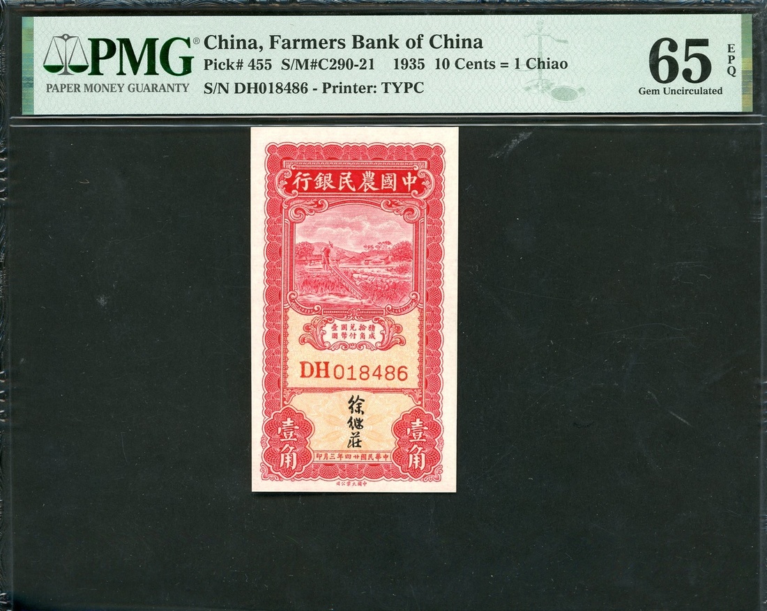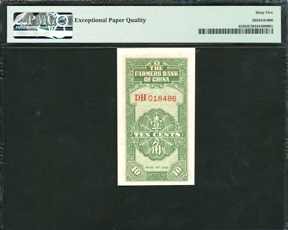 Farmers Bank of China, 10 cents, 1935, serial number DH018486, (Pick 455), PMG 66EPQ Gem Uncirculated