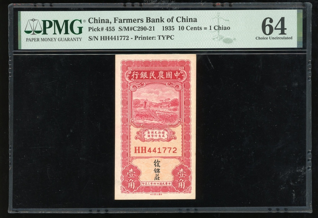 Farmer Bank of China, 1 chiao, Year 24(1935), serial number HH441772, (Pick 455), PMG 64 Choice Uncirculated.