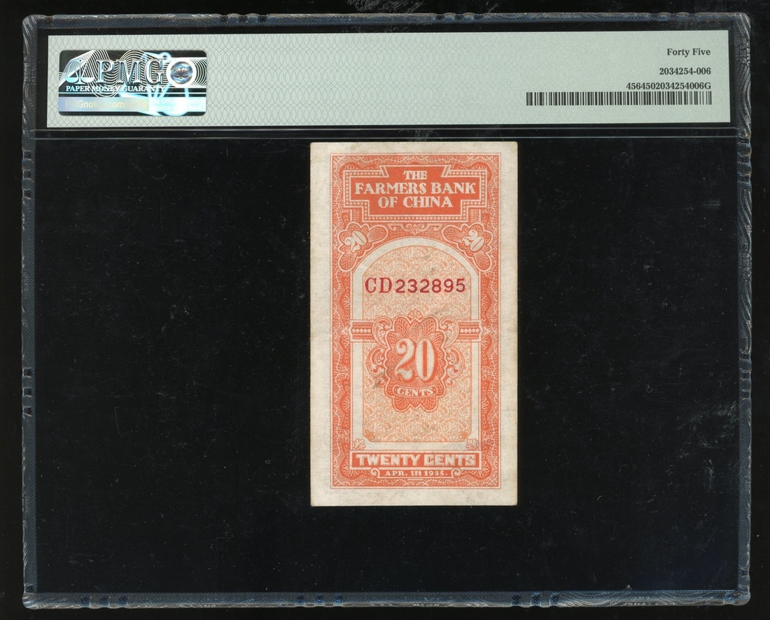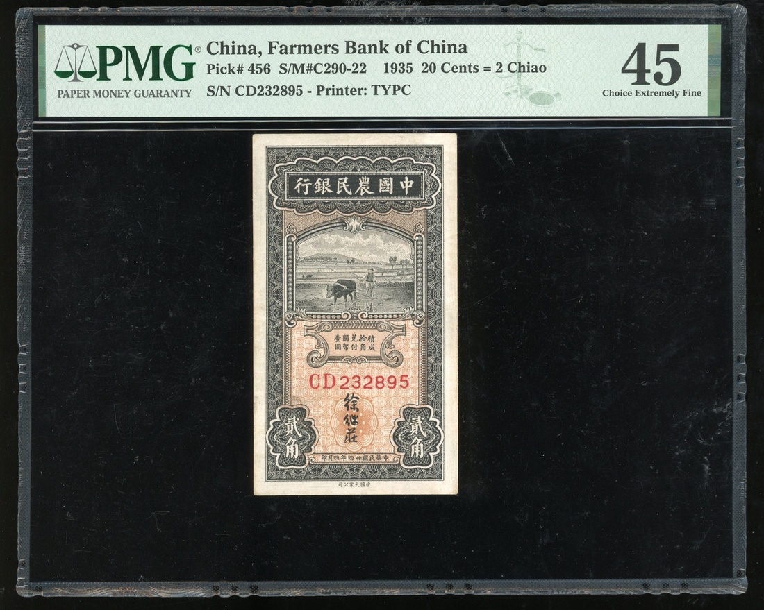 Farmer Bank of China, 2 chiao, Year 24(1935), serial number CD232895, (Pick 456), PMG 45 Choice Extremely Fine.