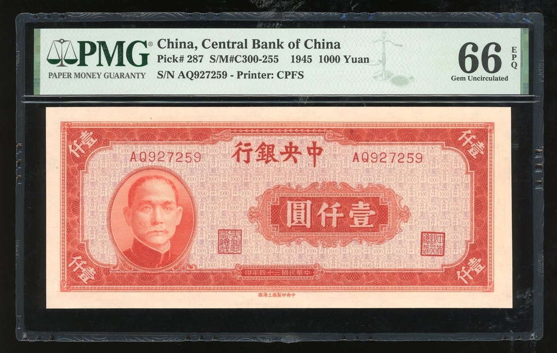 Central Bank of China, 1000 yuan, Year 34(1945), serial number AQ927259, (Pick 287), PMG 66EPQGem Uncirculated.