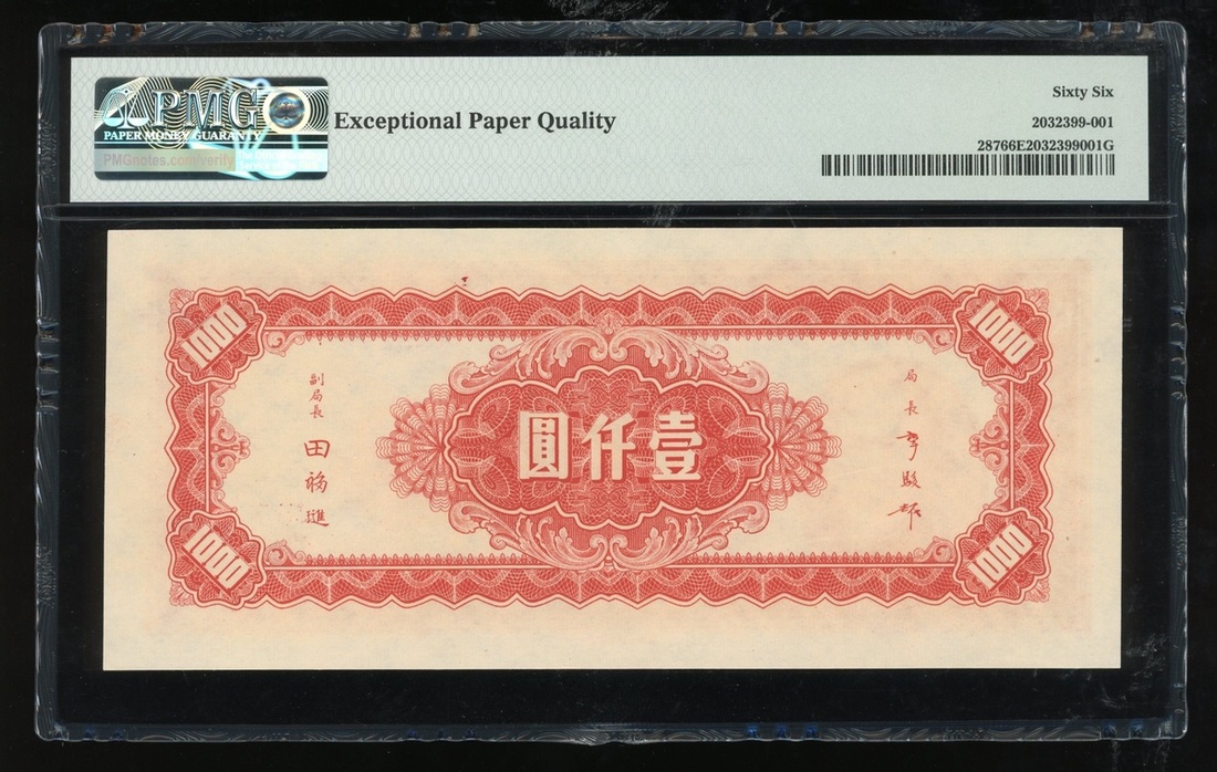 1945年中央銀行1000元,編號AQ927259,PMG 66EPQ