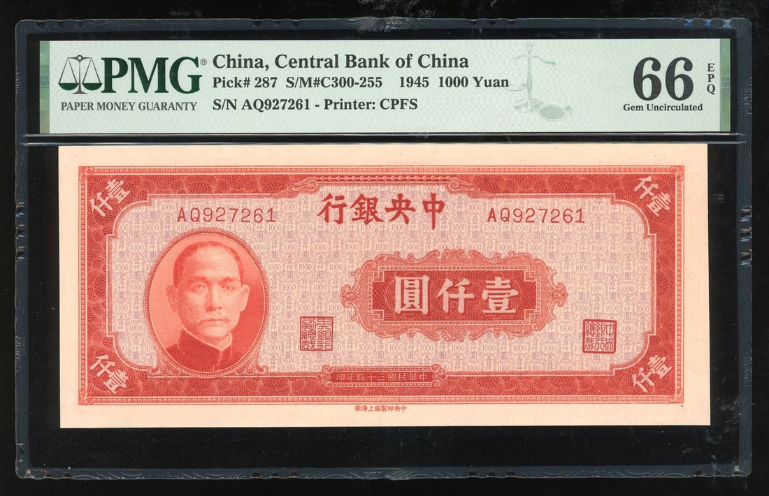 Central Bank of China, 1000 yuan, Year 34(1945), serial number AQ927261, (Pick 287), PMG 66EPQGem Uncirculated.