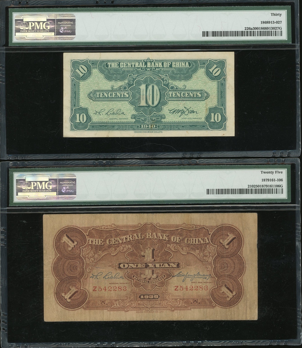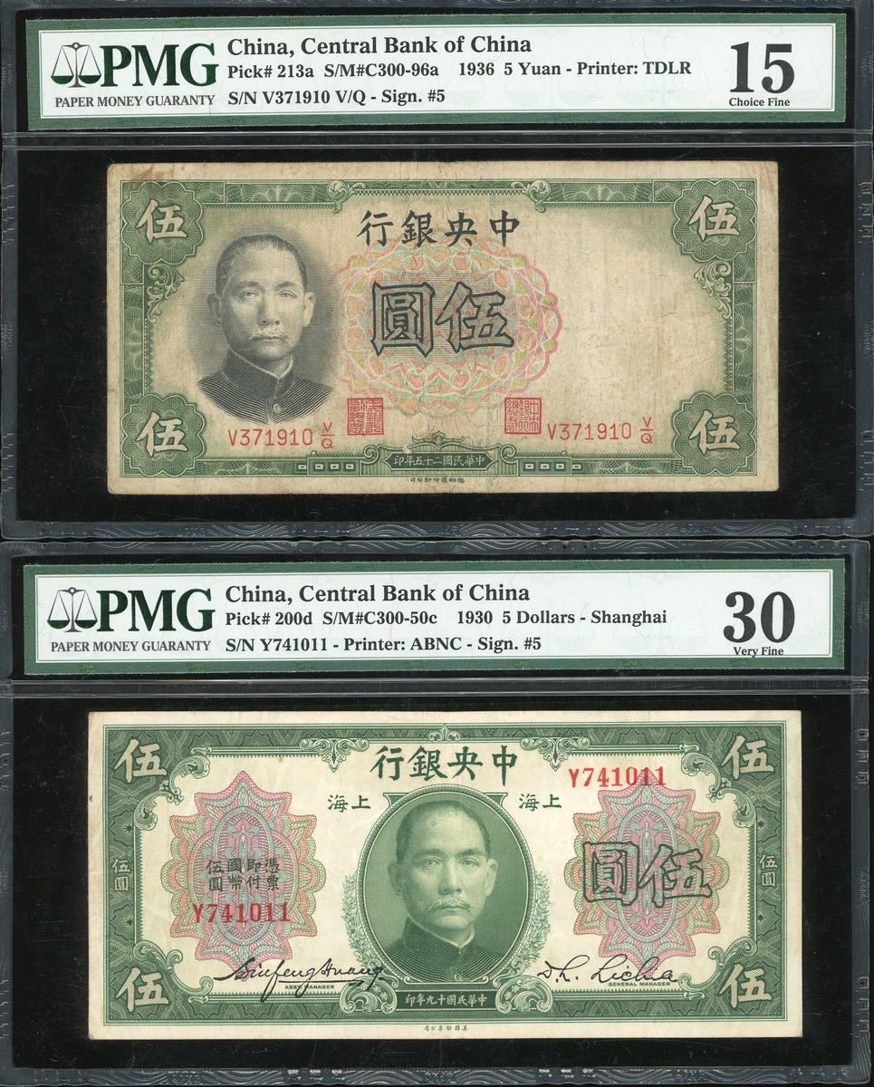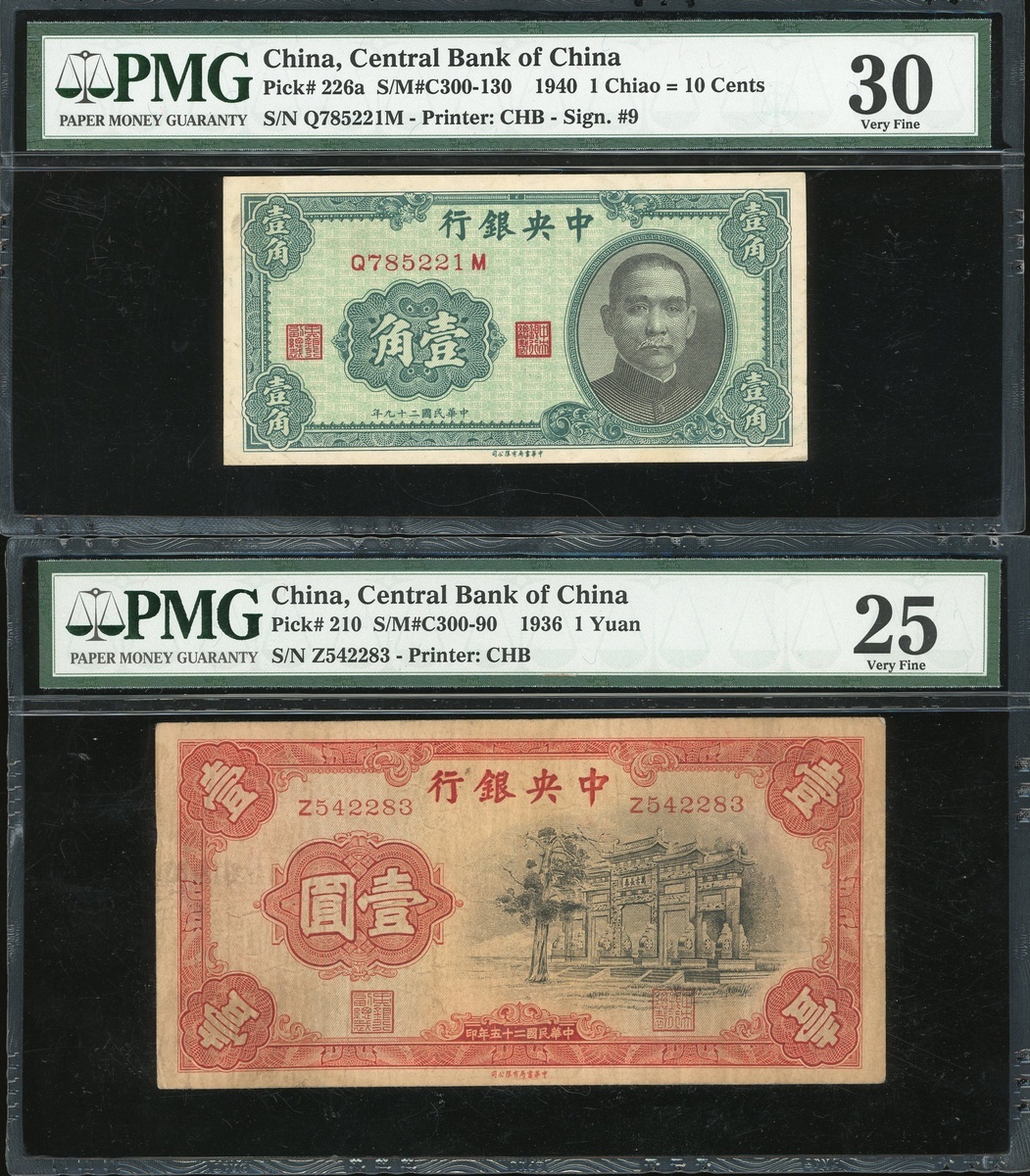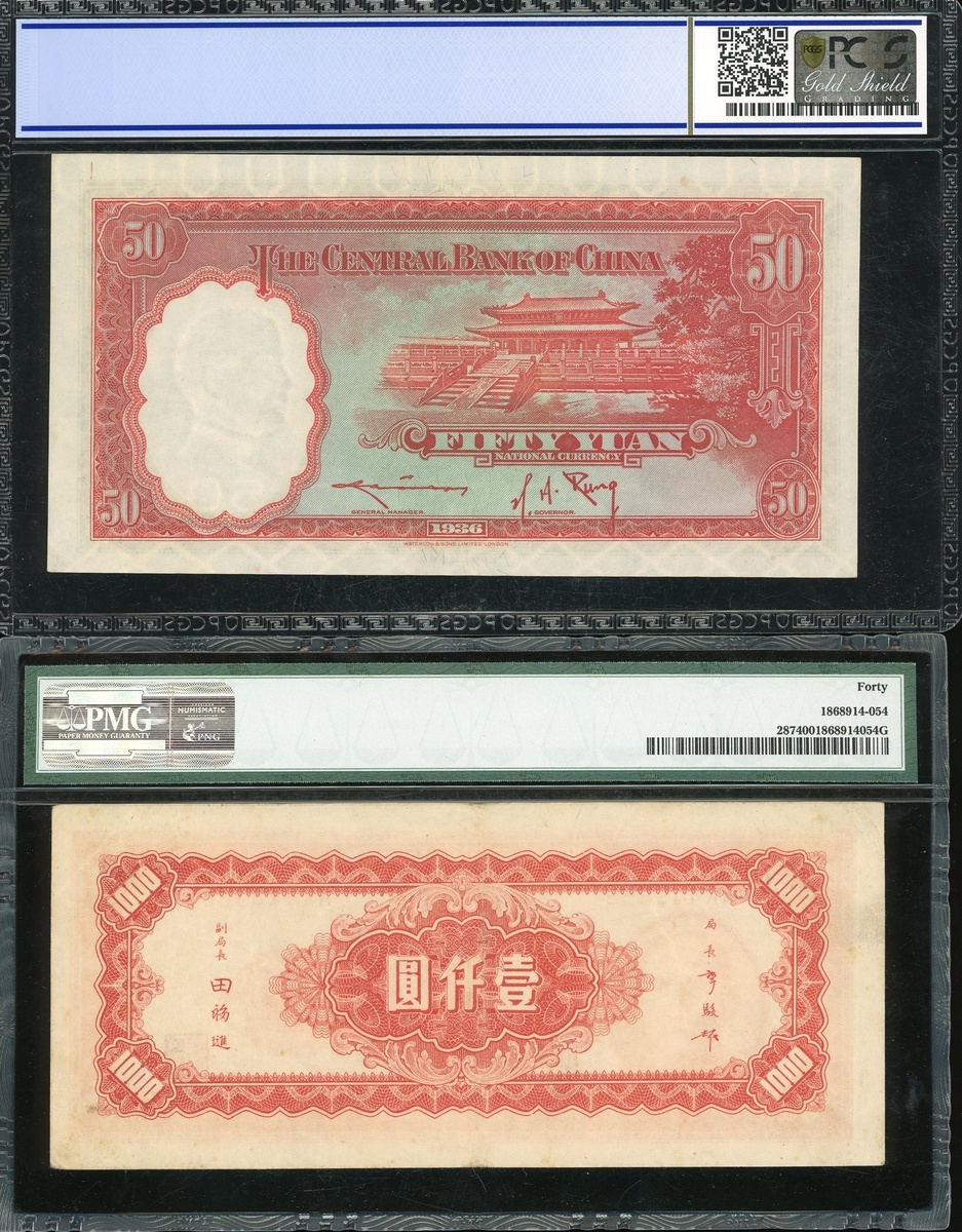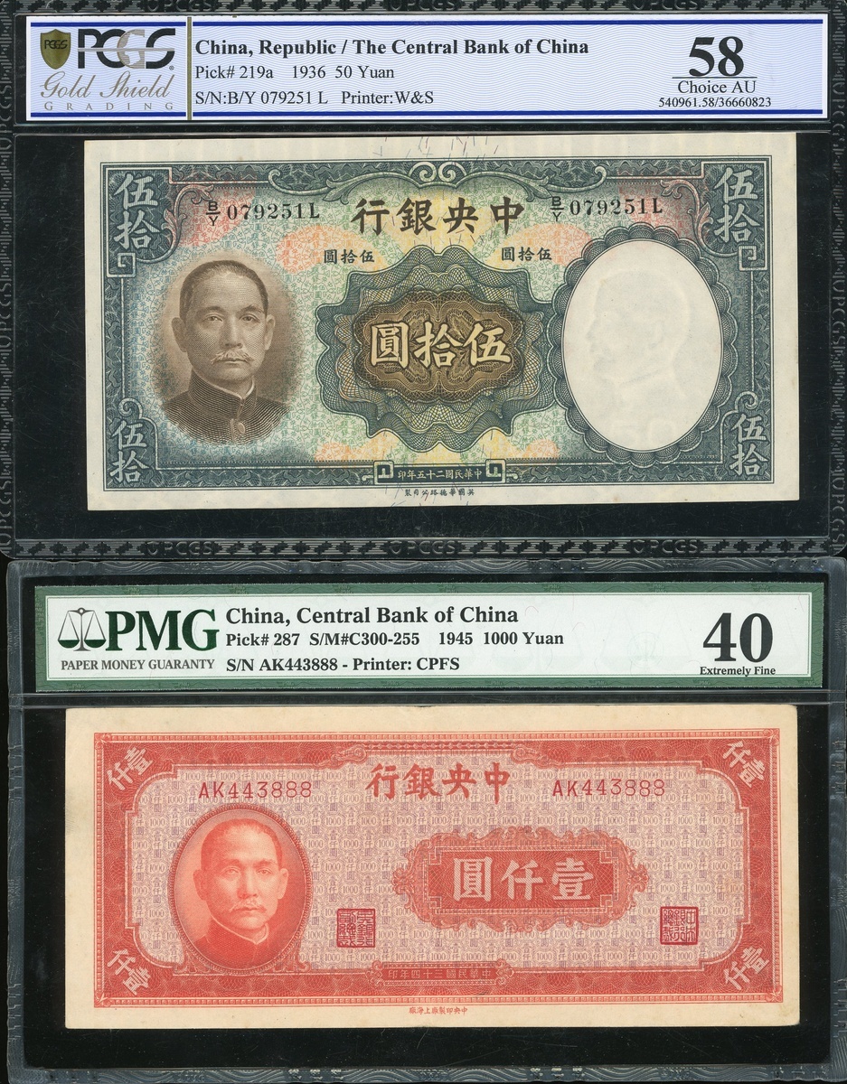Central Bank of China, a group of 12x notes, 1 chiao to 1000 yuan, 1930-1945, (Pick 200d-326d), 1936 50 yuan PCGS Gold Shield Grading 58 Choice AU, the rest PMG 15 to PMG 58 (12).