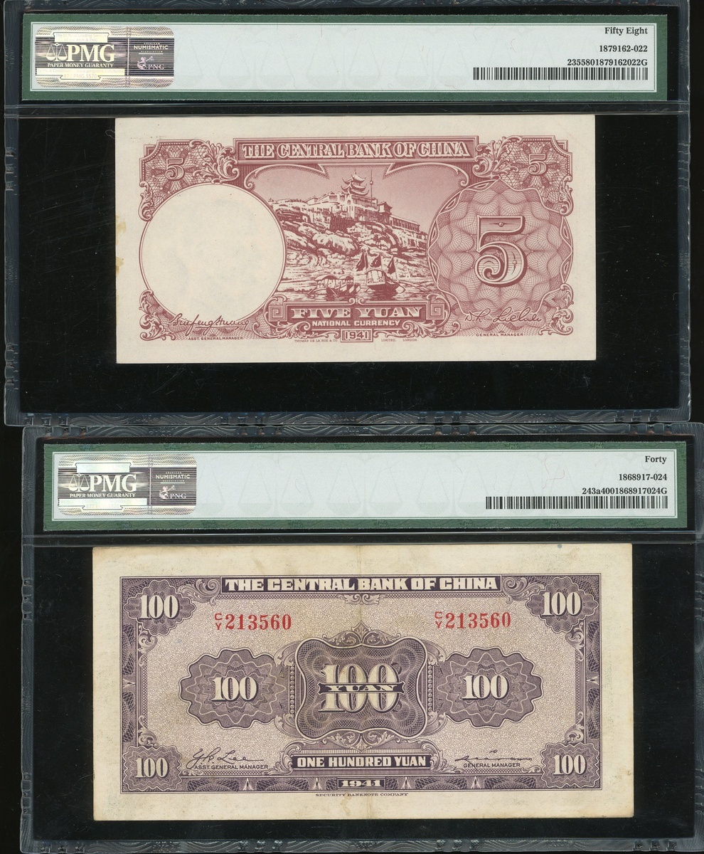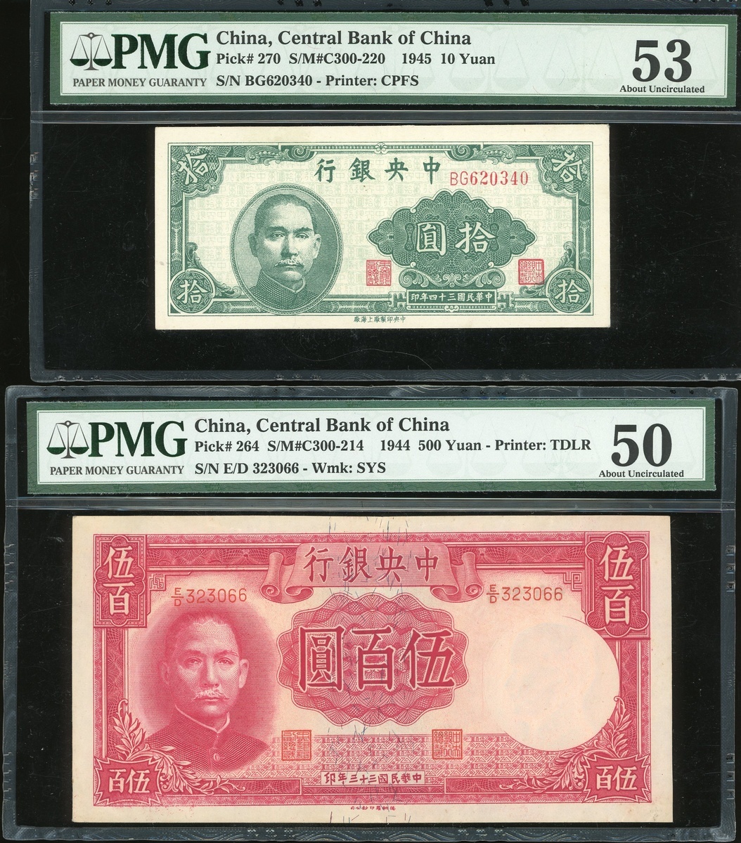 1930-1945年中央銀行紙幣一組12枚,1角至1000圓,50元評PCGS Gold Shield 58,給予PMG 15-58(12)
