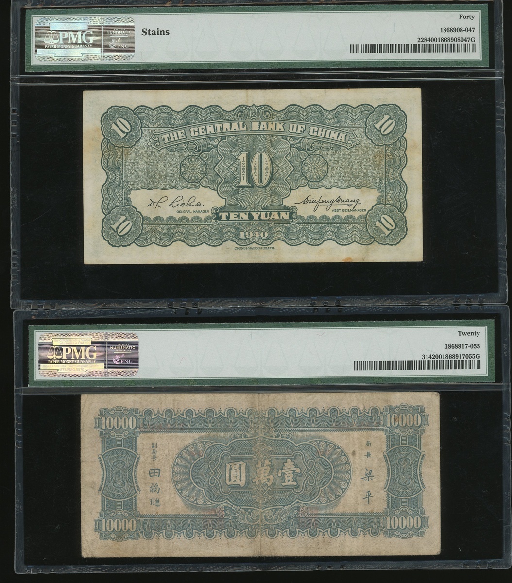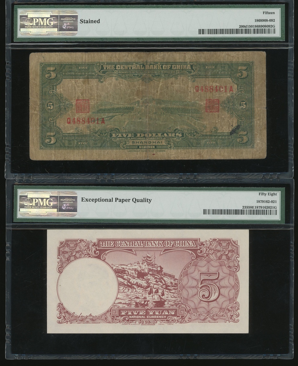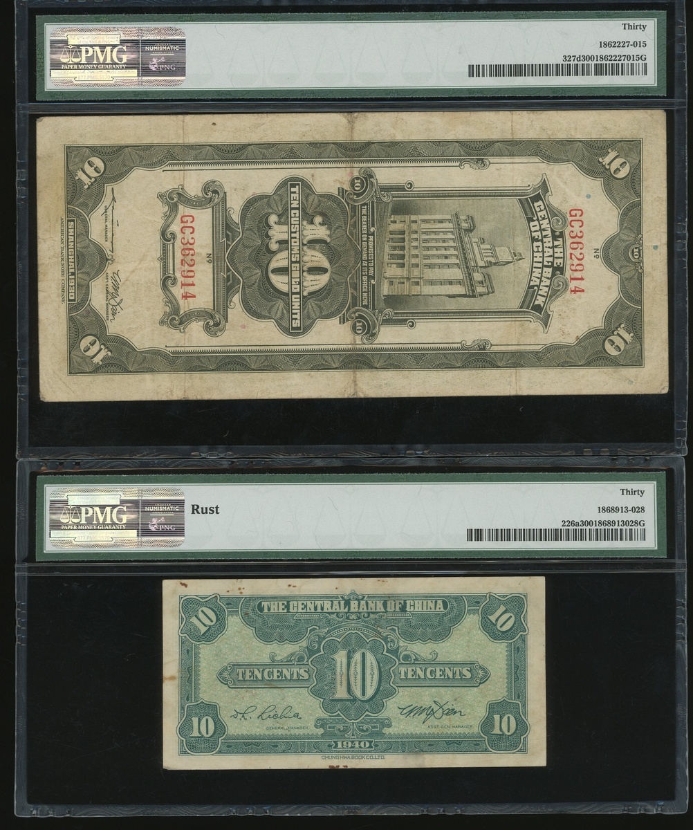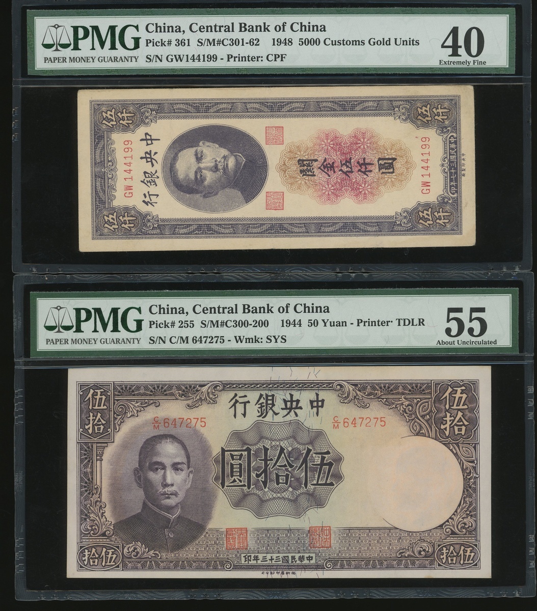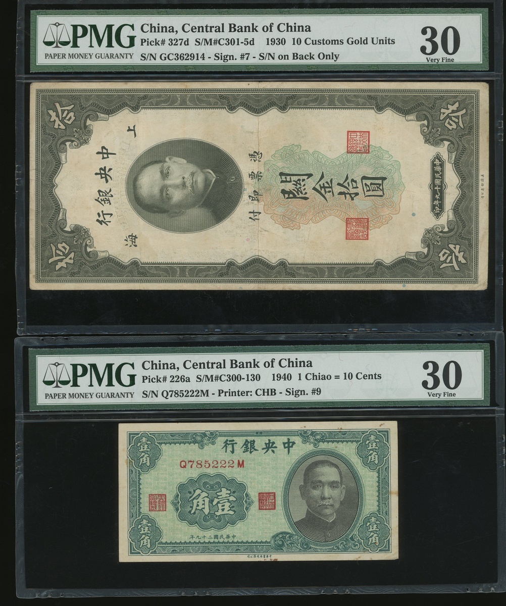 Central Bank of China, a group of 13x notes, 1 chiao to 5000 Customs Gold Units, 1930-1948, (various Picks), all in PMG holders, PMG 15 to 58EPQ (13).