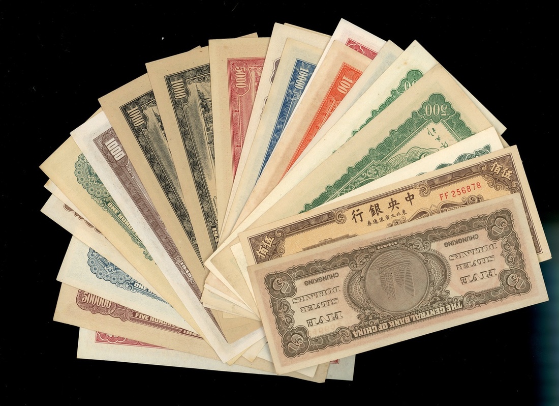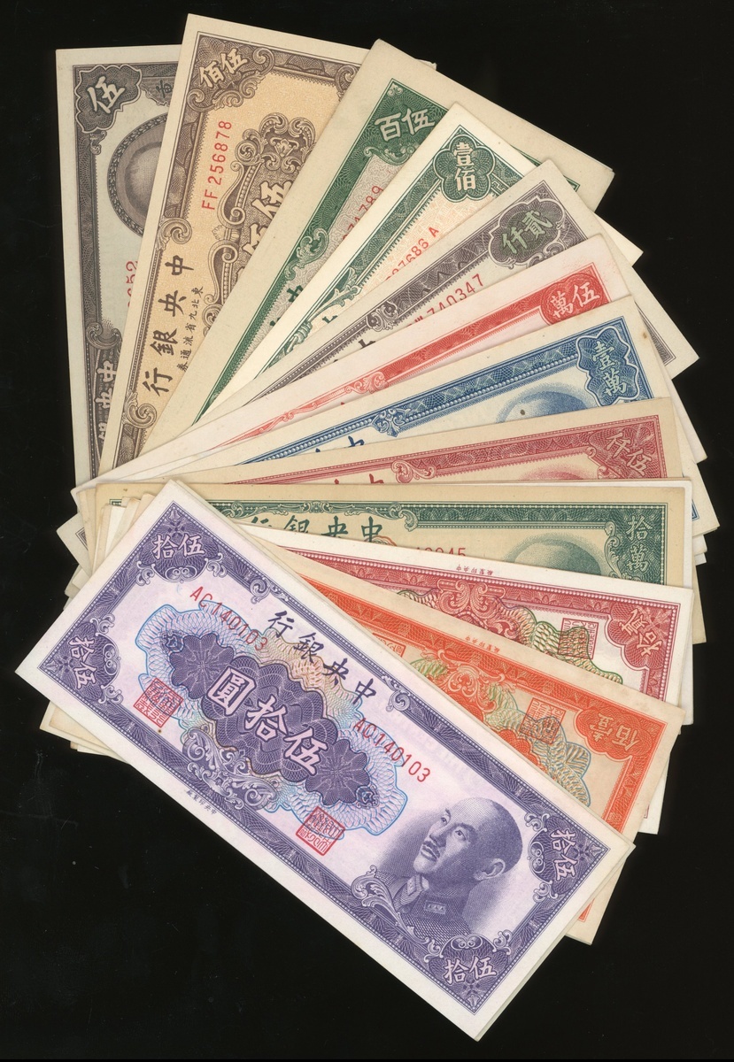 Central Bank of China, a group of 22x Gold Yuan notes, 1948-1949, from 50 cents to 500,000 yuan, and also 6 notes for circulation in the Northeast 100 yuan (2), 500 yuan (2) and 2000 yuan, finally also a 5 Silver Yuan note, Chungking, (Pick various), generally almost uncirculated to uncirculated (29)