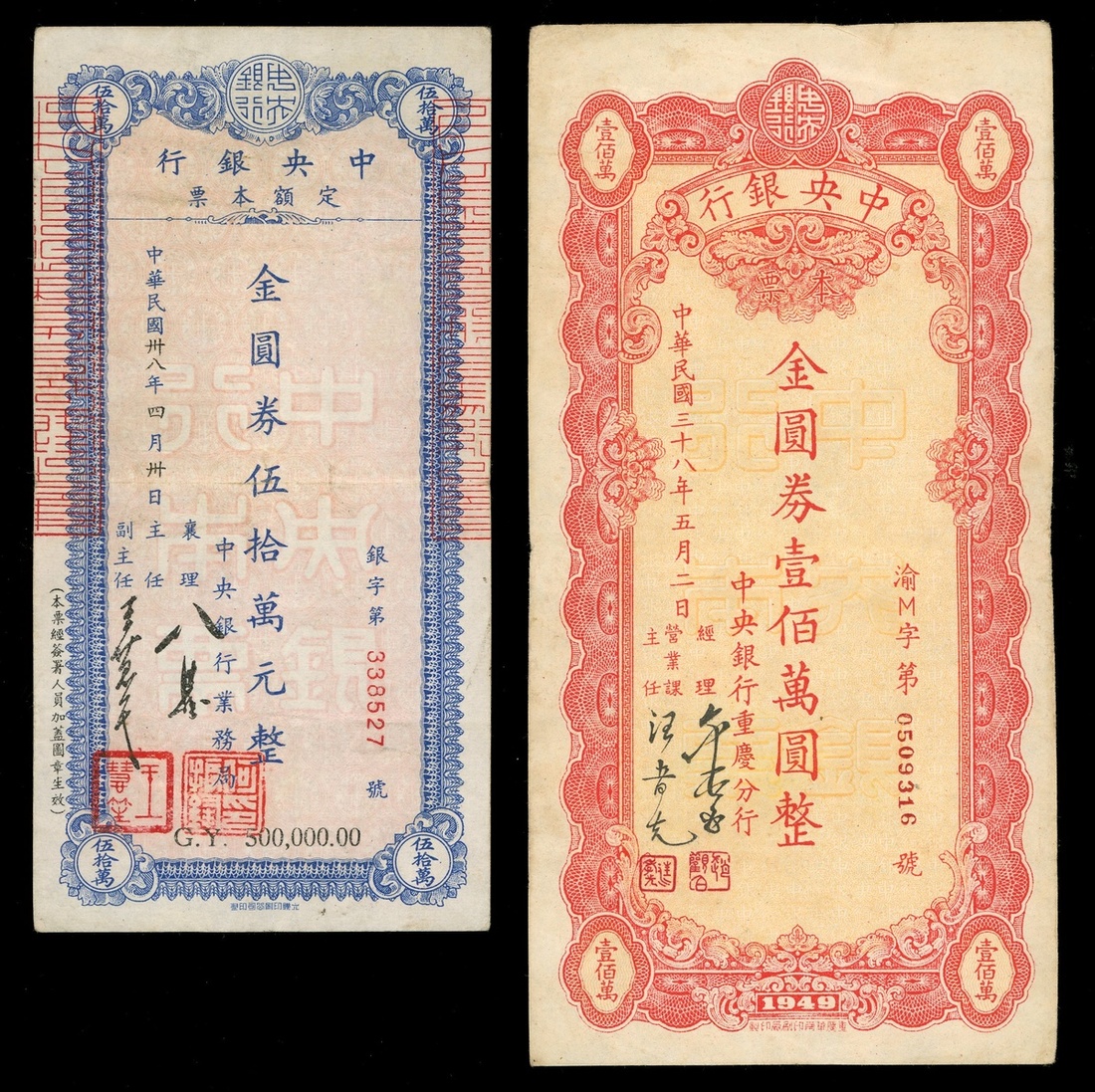 1949年中央銀行銀行本票一組4枚,五十萬元,一百萬 元及五百萬元(2),編號338527, 0509316, 564228 及 0634162,VF至EF