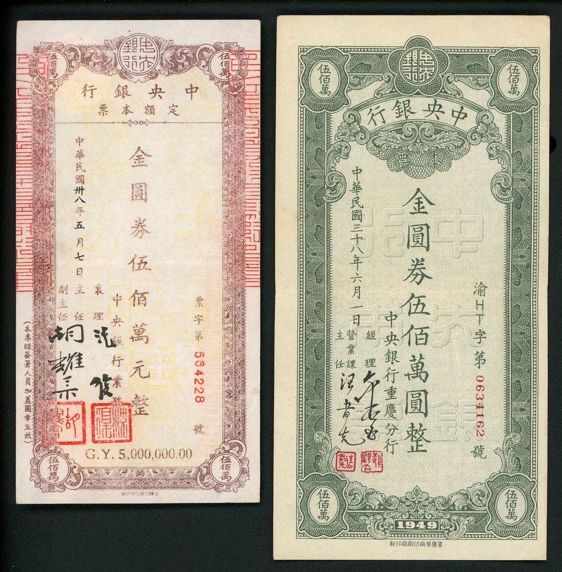 The Central Bank of China, group of 4x cashier's cheque, 500,000 Yuan, 1,000,000 Yuan and 5,000,000 Yuan (2), 1949, serial numbers 338527, 0509316, 564228 and 0634162,