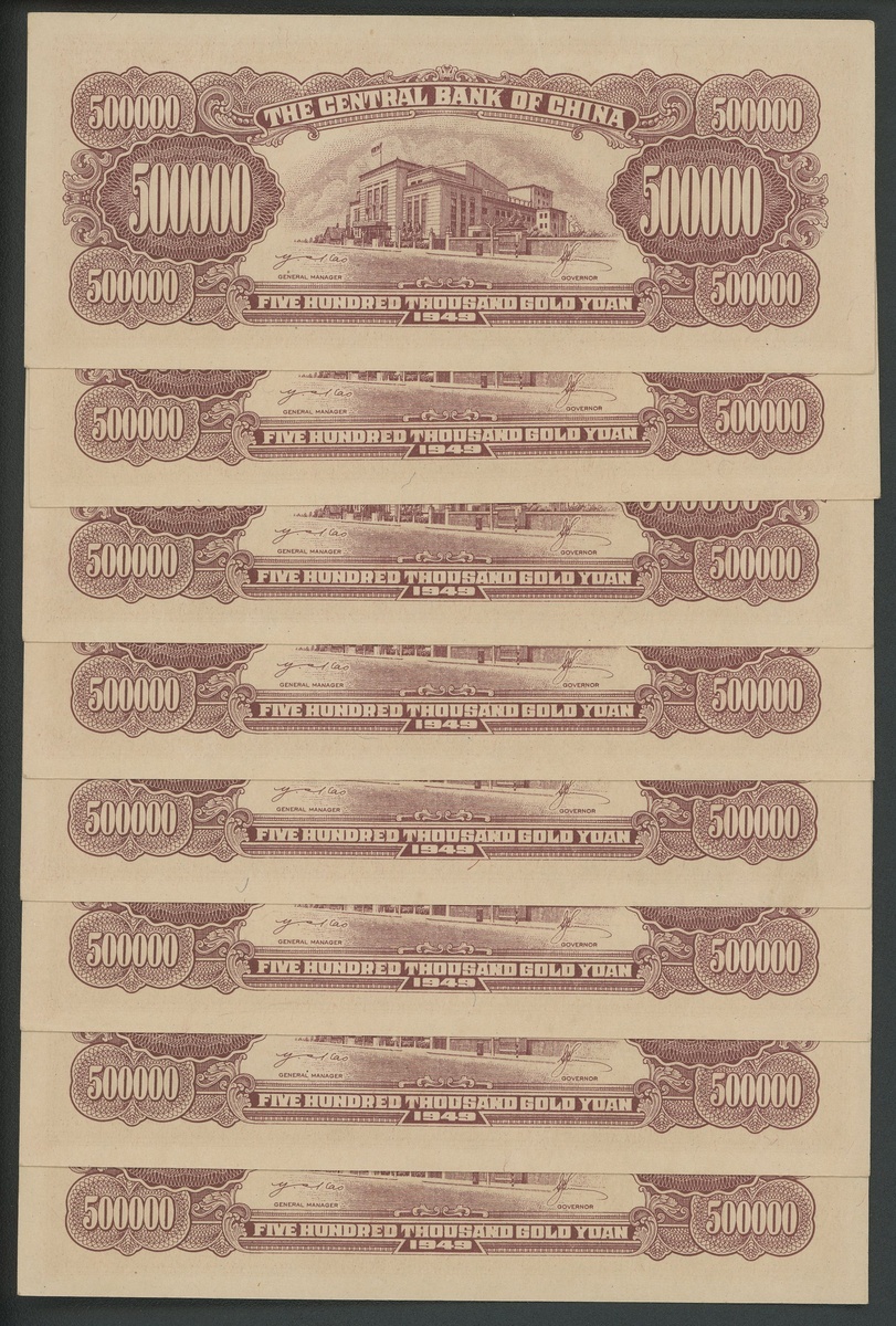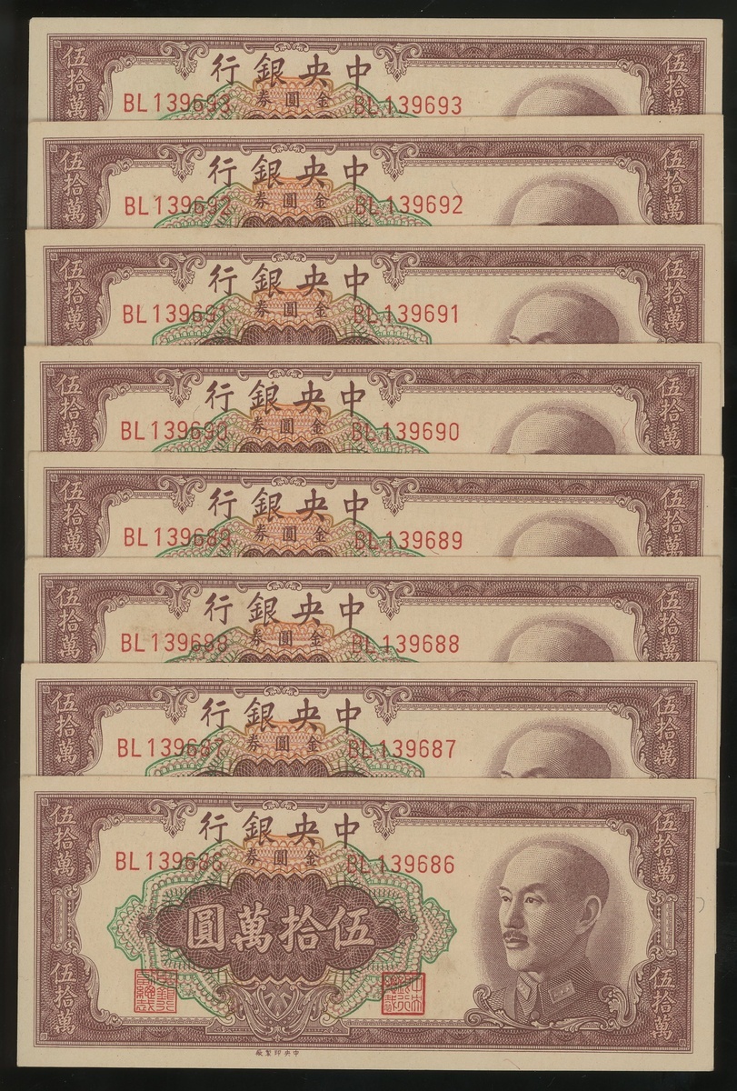 1949年中央銀行金圓券五十萬圓連號8枚,中央版,編號BL139686-93,AU/UNC,帶微黃