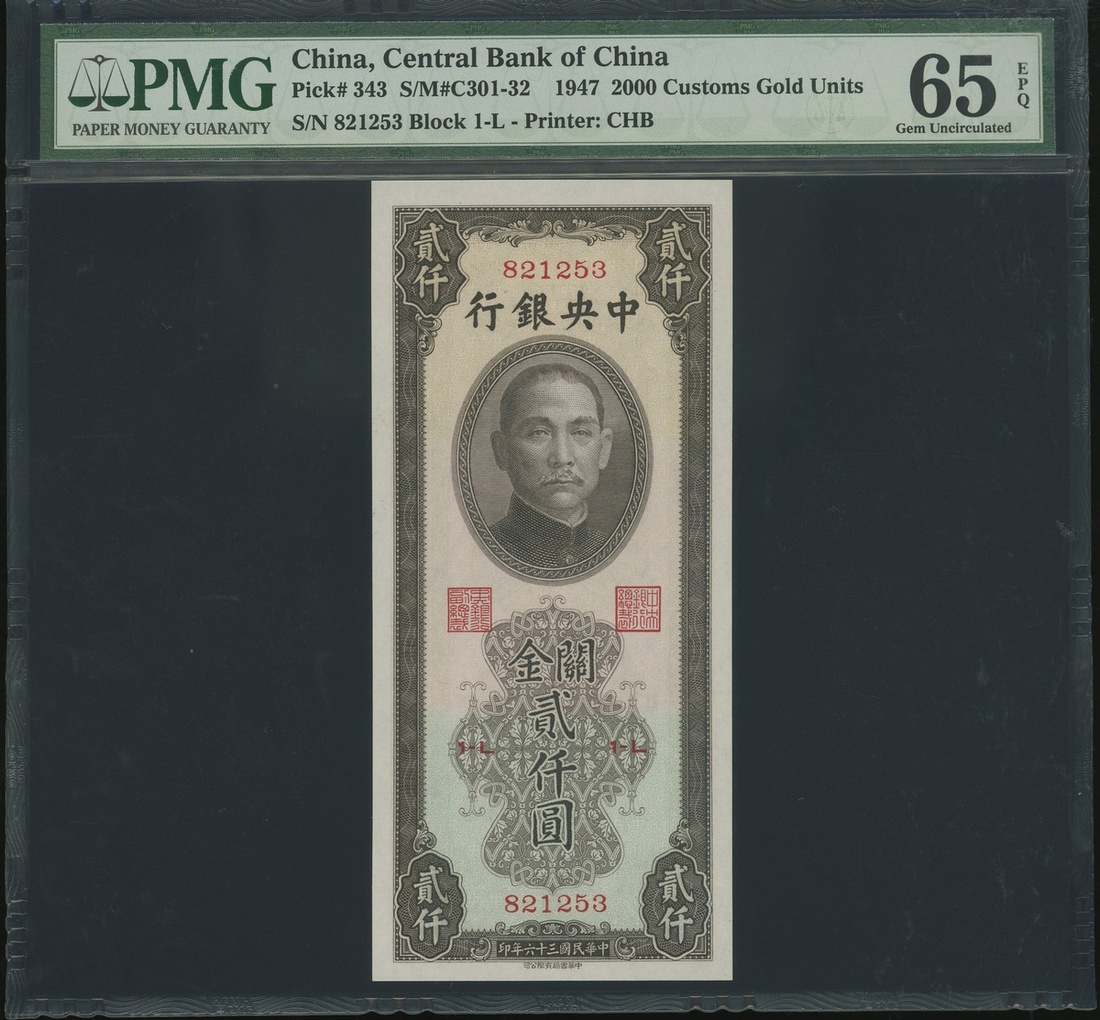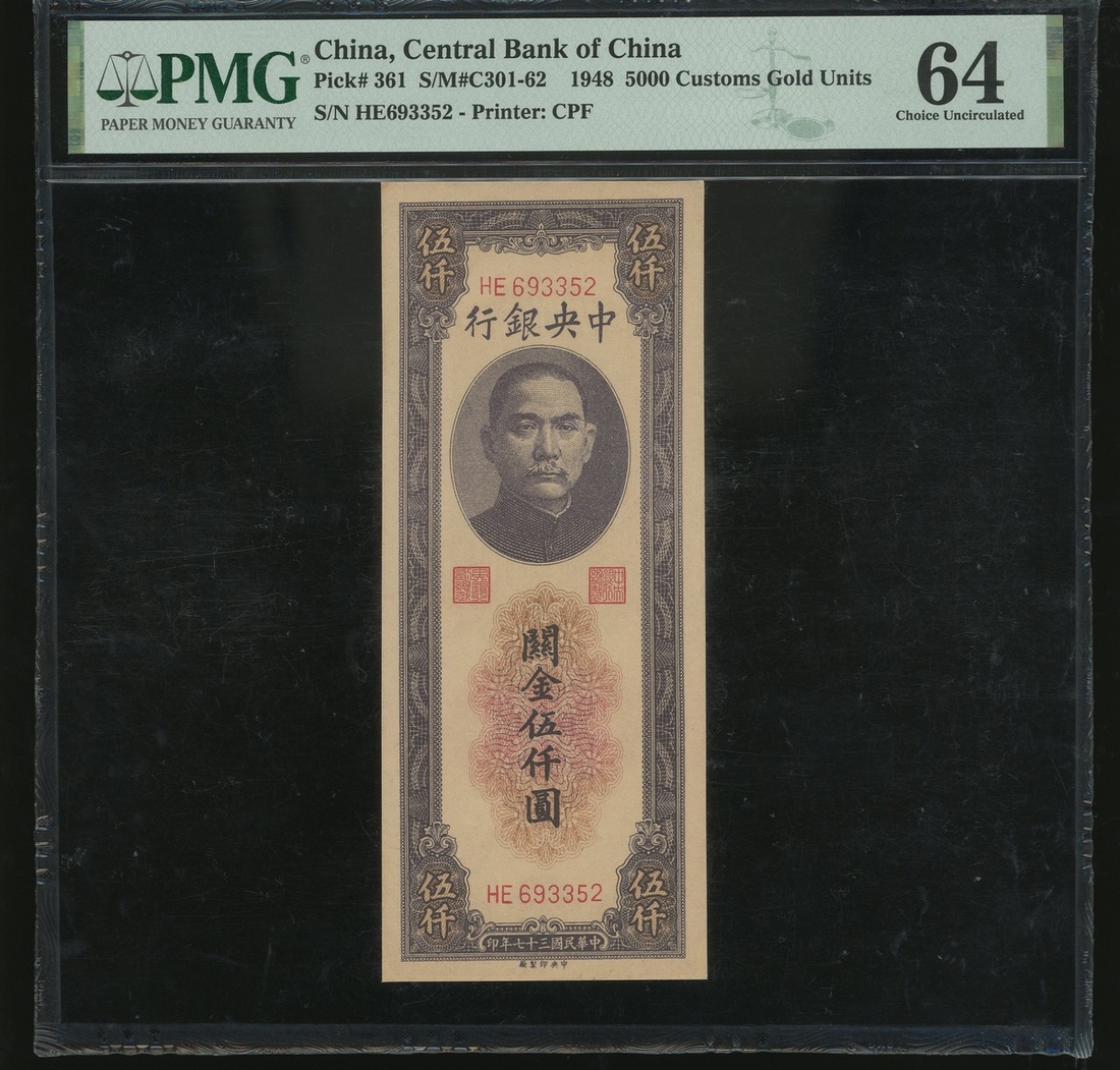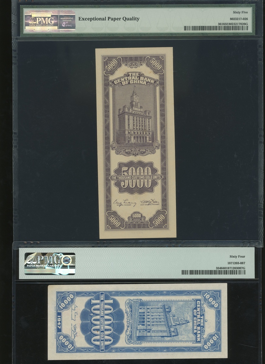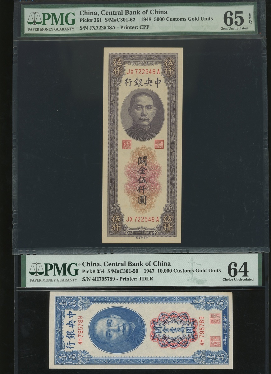 The Central Bank of China, group of 5 Customs Gold Unit notes, consisting of: 1 Yuan, Shanghai, 1930, 2000 Yuan, 1947, 2x 5000 Yuan, 1948 and 10000 Yuan, 1947, serial numbers NB107754, 821253, HE693352, JX722548A and 4H795789, (Pick 325d, 343, 361, 354), all graded PMG 64 to 66EPQ. (5)