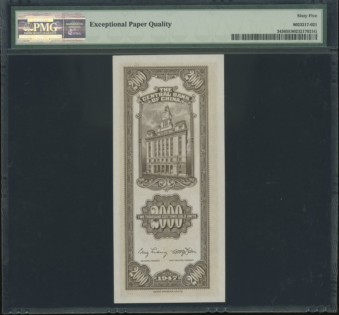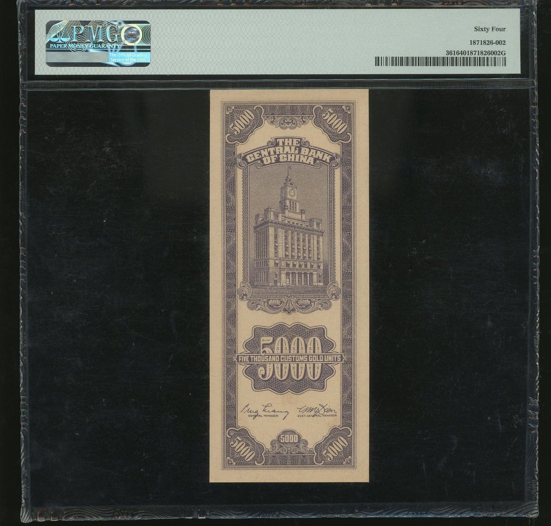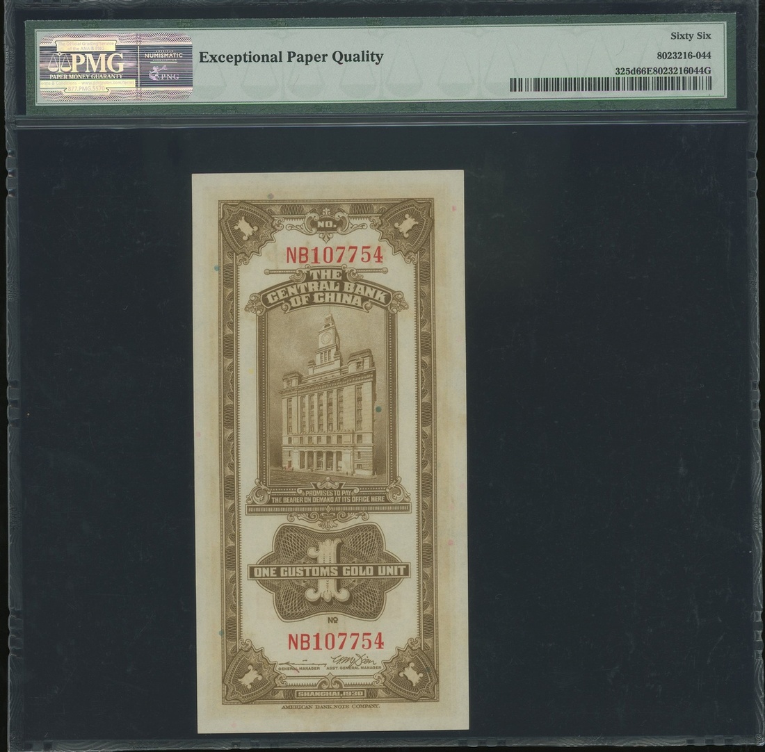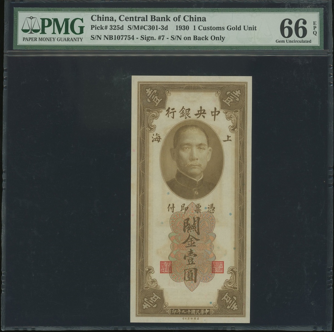 The Central Bank of China, group of 5 Customs Gold Unit notes, consisting of: 1 Yuan, Shanghai, 1930, 2000 Yuan, 1947, 2x 5000 Yuan, 1948 and 10000 Yuan, 1947, serial numbers NB107754, 821253, HE693352, JX722548A and 4H795789, (Pick 325d, 343, 361, 354), all graded PMG 64 to 66EPQ. (5)
