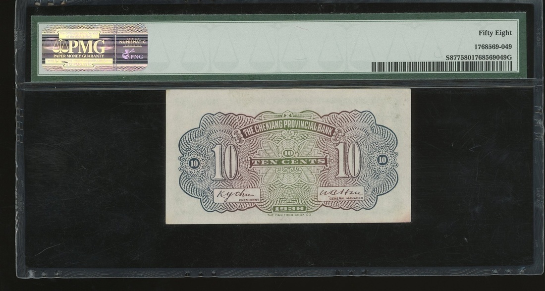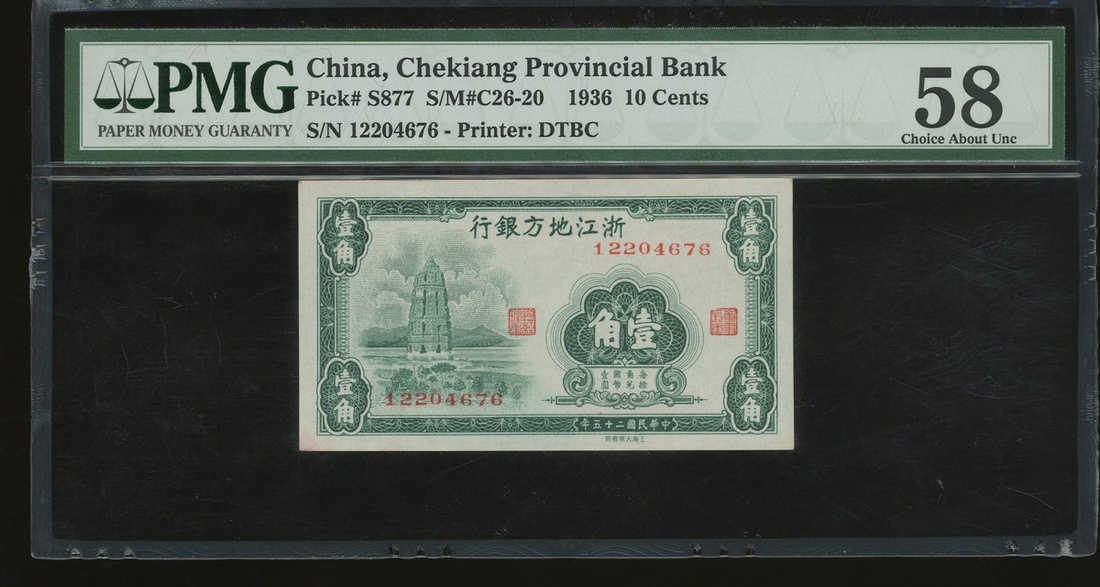Chekiang Provincial Bank, 10 cents, Year 25(1936), serial number 12204676, (Pick S877), PMG 58 Choice About Uncirculated