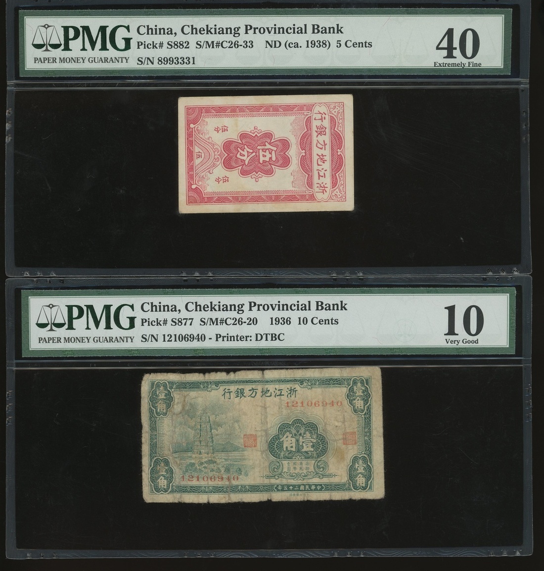 1932至1938年浙江地方銀行紙幣一組5枚,5分至1元,均PMG 10-40,部分有修補(5)