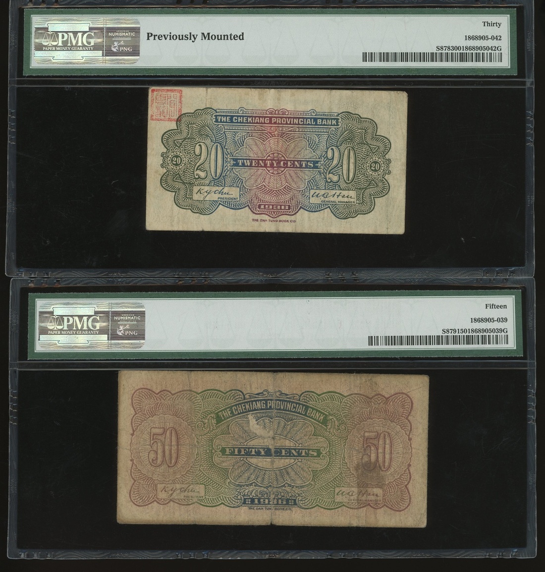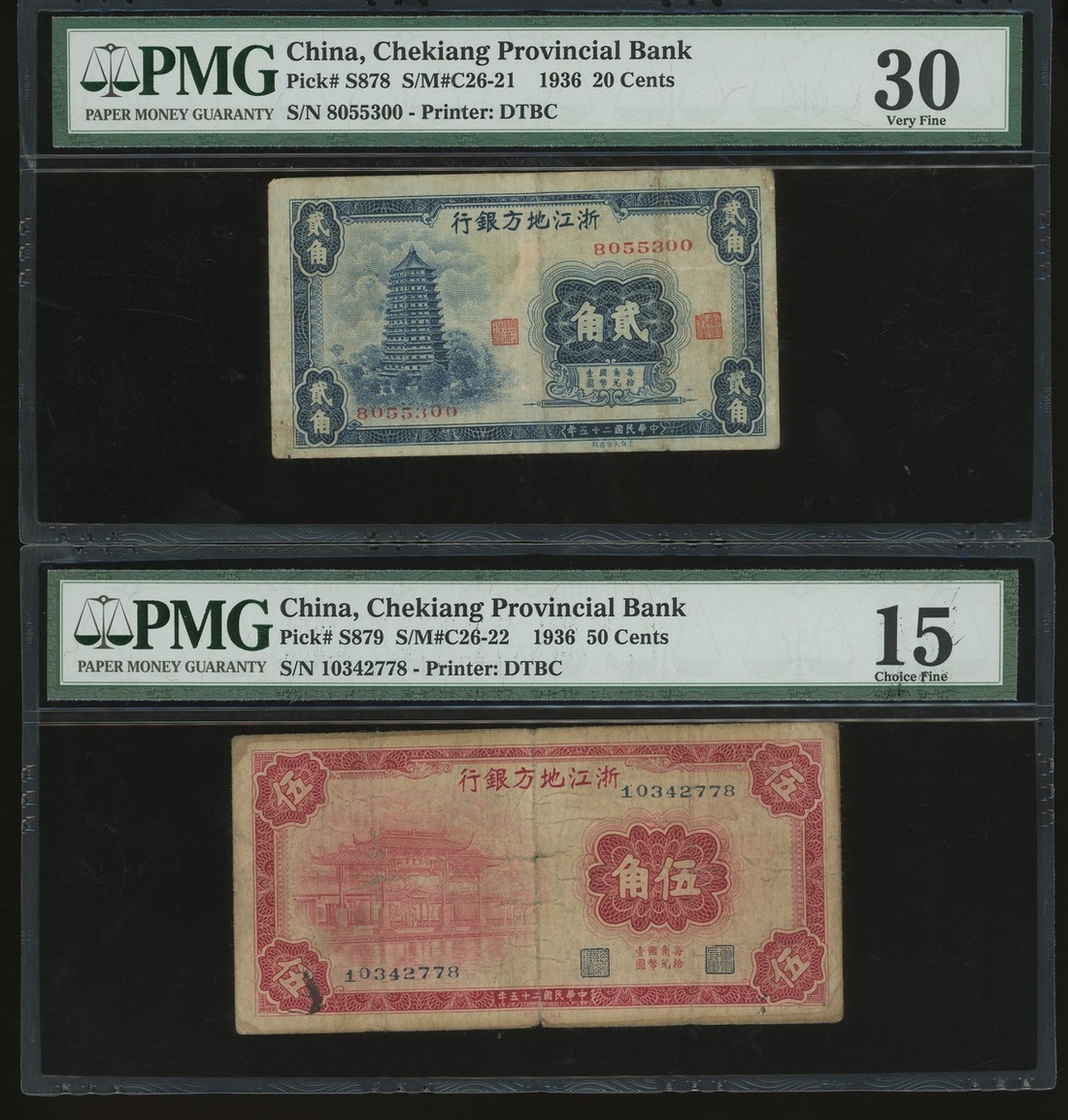 Chekiang Provincial Bank, a group of 5x notes, 5 cents, 10 cents, 20 cents, 50 cents and $1, 1932-1938, serial numbers 8993331, 12106940, 8055300, 10342778 and D203962, $1 from Hangchow,