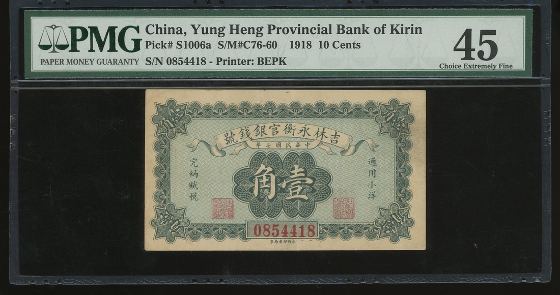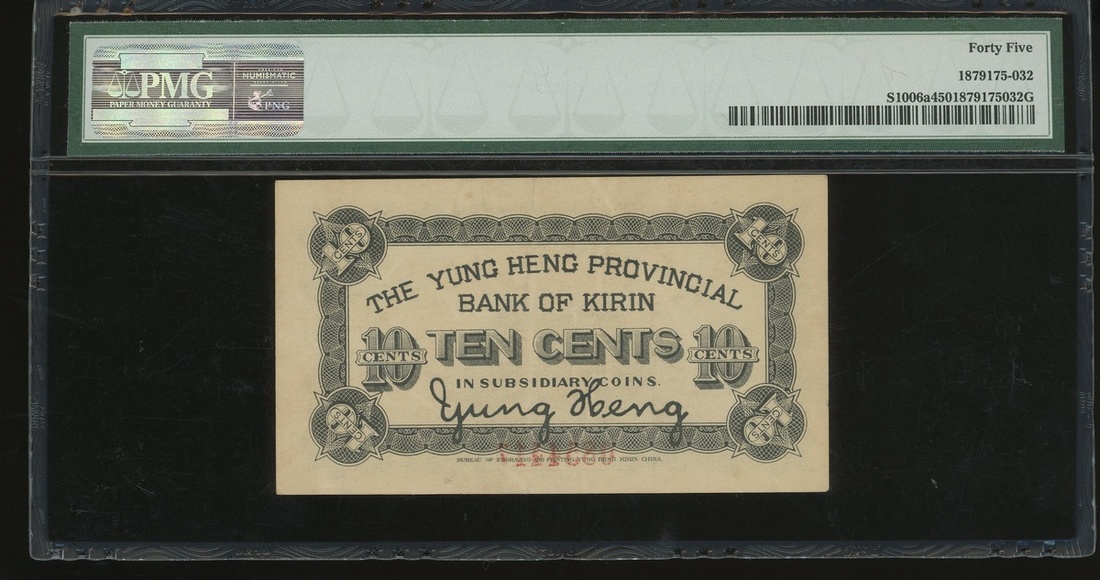 Yuen Heng Provincial Bank of Kirin, 10 cents, Year 7(1928), serial number 0854418, (Pick S1006a), PMG 45 Choice Extremely Fine.