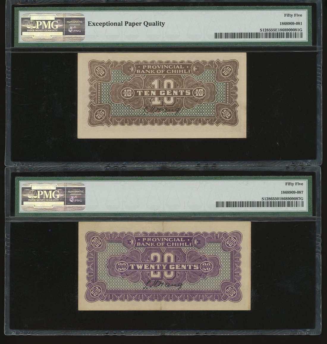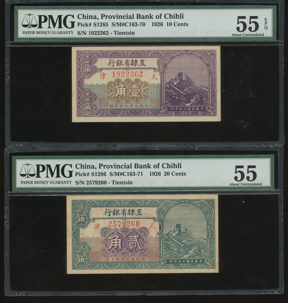 Provincial Bank of Chihli, a pair of 10 cents and 20 cents, Tientsin, Year 15(1926), serial numbers 1922362 and 2579260, (Pick S1285 and S1286), graded PMG 55EPQ and 55 respectively (2).