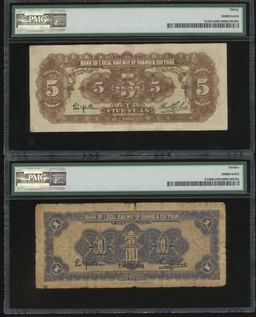 Local Railway of Shansi and Suiyuan, a pair of 1 yuan and 5 yuan, Taiyuan and Shanxi, Year 23(1934) and Year 25(1936), serial numbers T0081397 and C2052363, (Pick S1294c and S1301a), graded PMG 12 and 30 respectively, scarce (2).