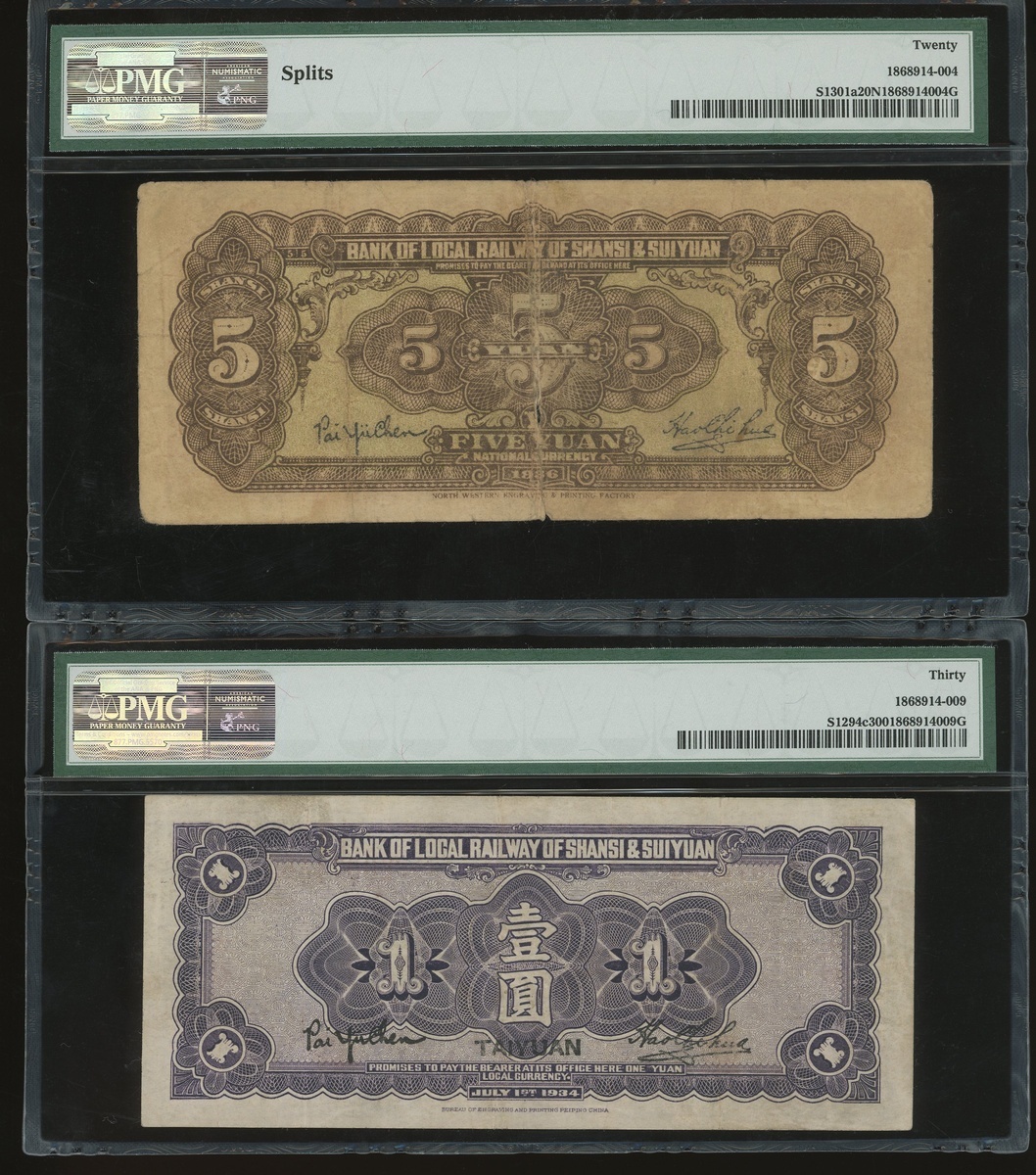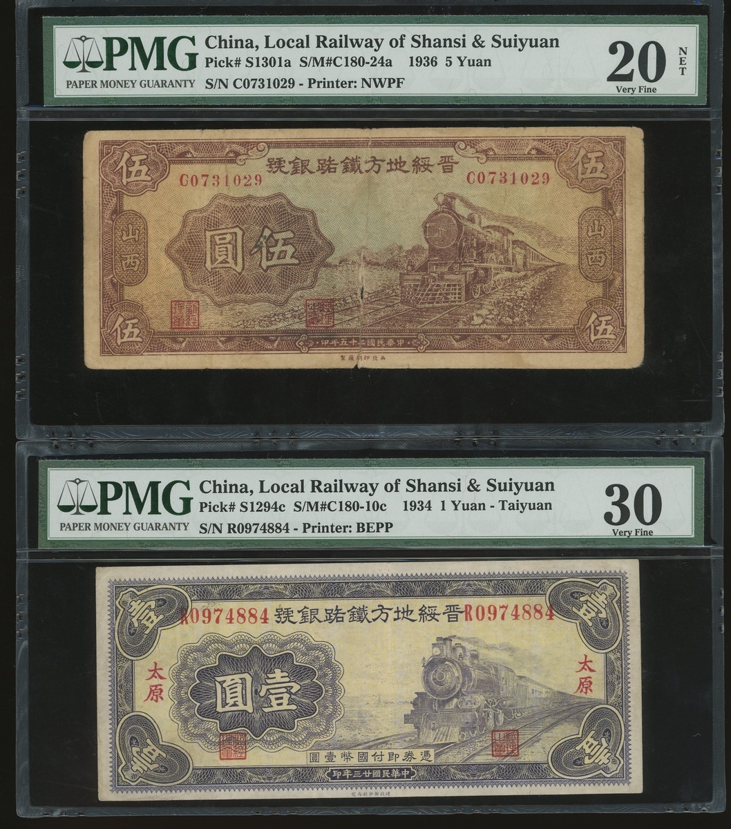 Local Railway of Shansi & Suiyuan, a pair of 1 yuan, Taiyuan and 5 yuan, Year 23(1934) and Year 25(1936), serial numbers R0974884 and C0731029, (Pick S1294c and S1301a), graded PMG 30 and 20NET (Splits) respectively (2).