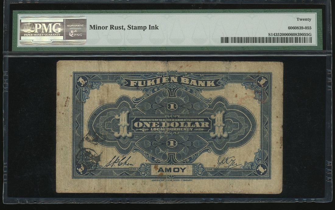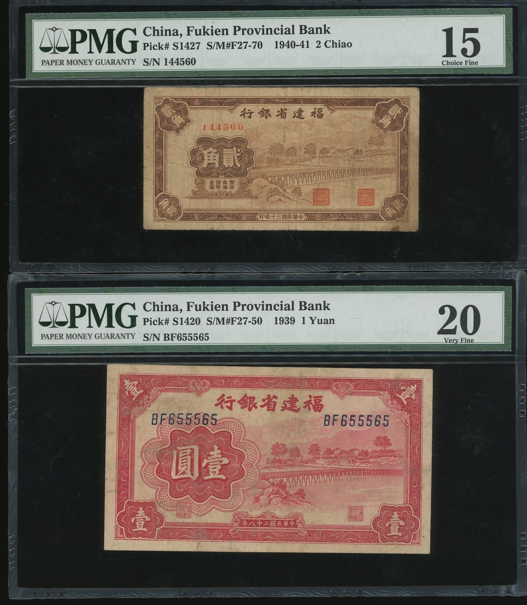 Fukien Provincial Bank, 2 chiao and 1 yuan, Year 31(1940) and Year 28(1939), and Fukien Bank, $1, ND (1915), serial numbers 144560, BF655565 and 045734, (Pick S1427, S1420 and S1435), PMG 15 (Minor Rust), 20 and 20 (Minor Rust, Stamp Ink) respectively (3).