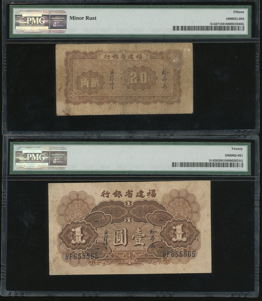 1939至1940年福建省銀行2角、1元各一枚,1915年福建銀行1元,編號 144560,BF655565及045734。均PMG 15-20(3)