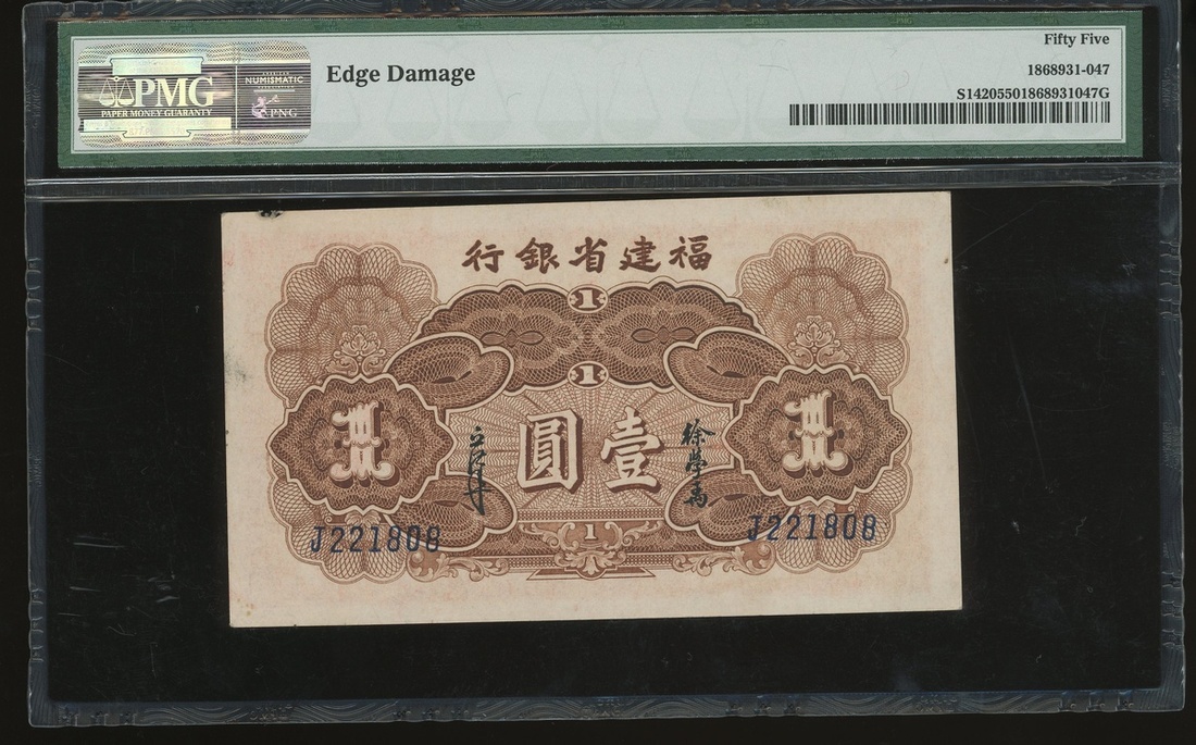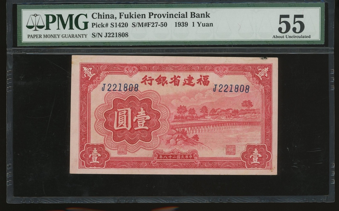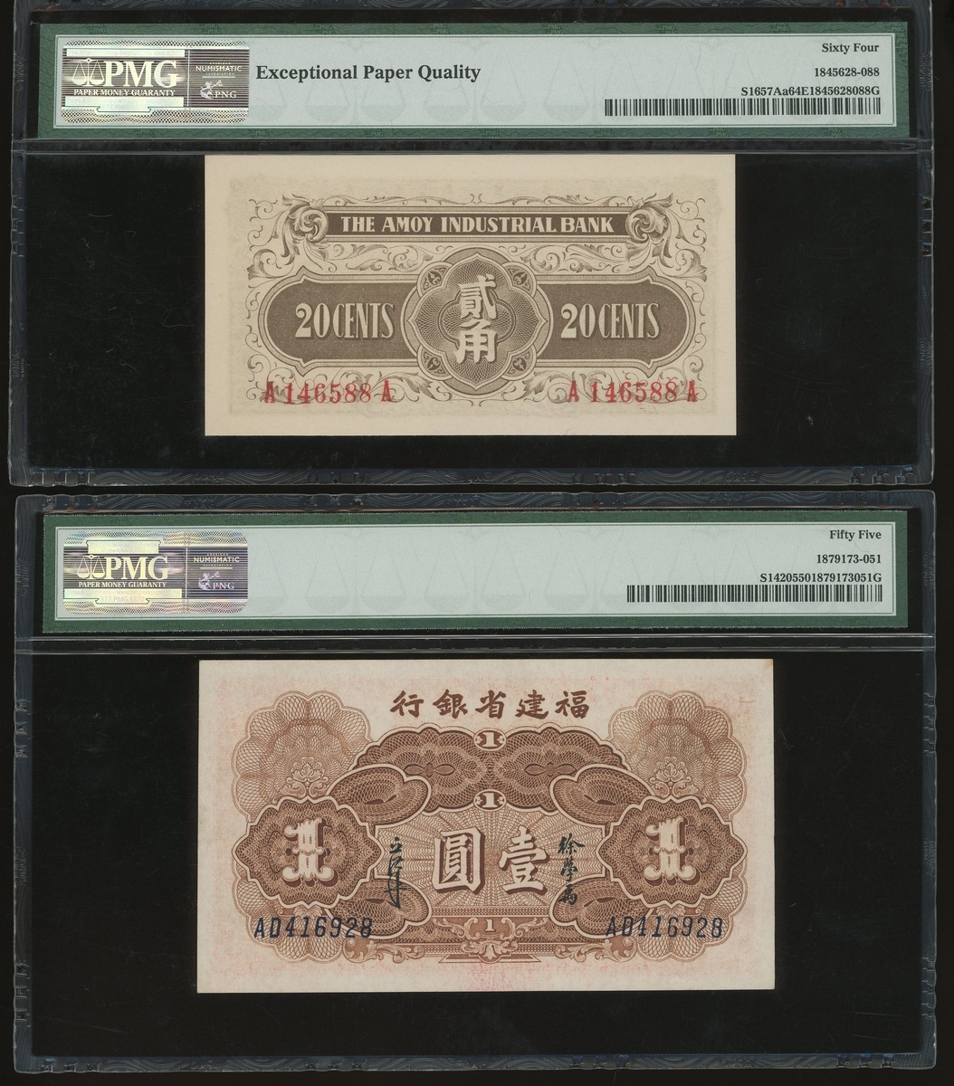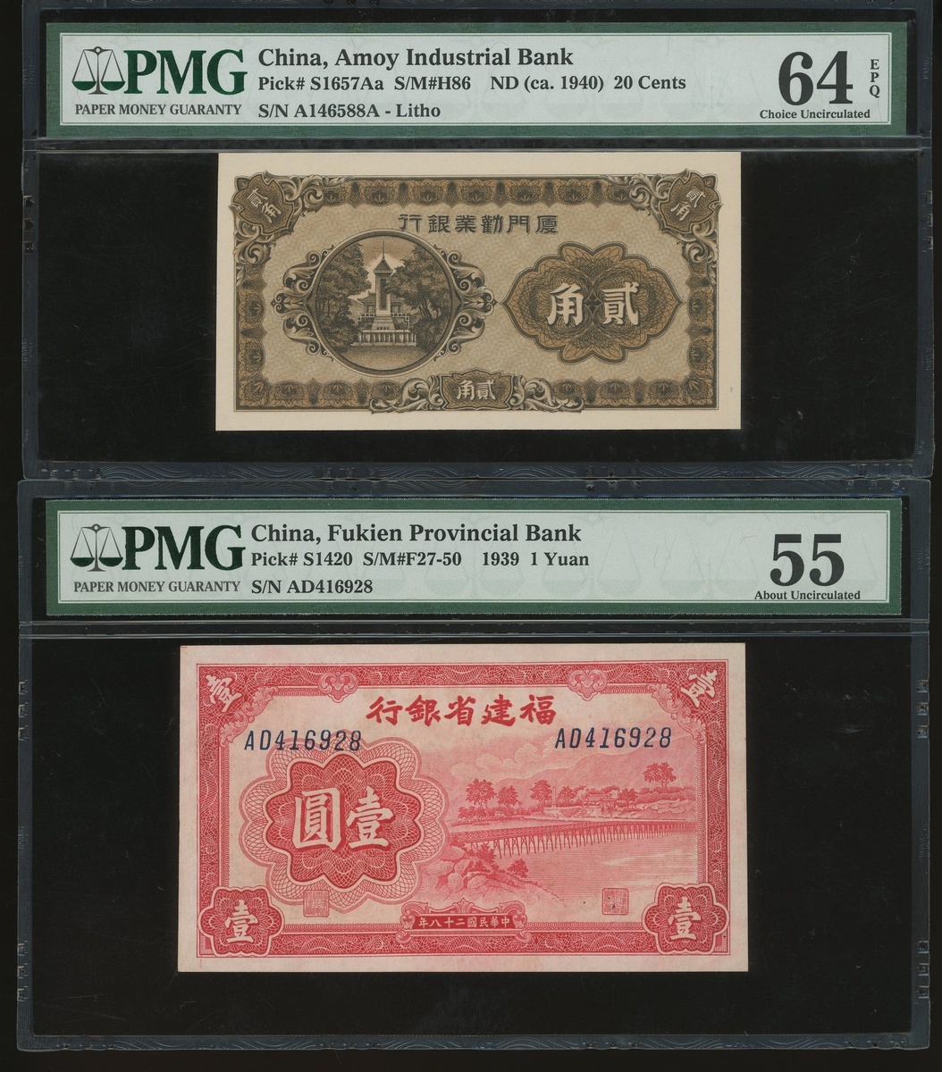 Fukien Provincial Bank, a pair of 1 yuan, Year 28(1939) and Amoy Industrial Bank, 20 cents, ND (ca.1940), serial numbers AD416928, J221808 and A146588A, (Pick S1420 and S1657Aa), both 1 yuan graded PMG 55, one with edge damage, 20 cents PMG 64EPQ (3).