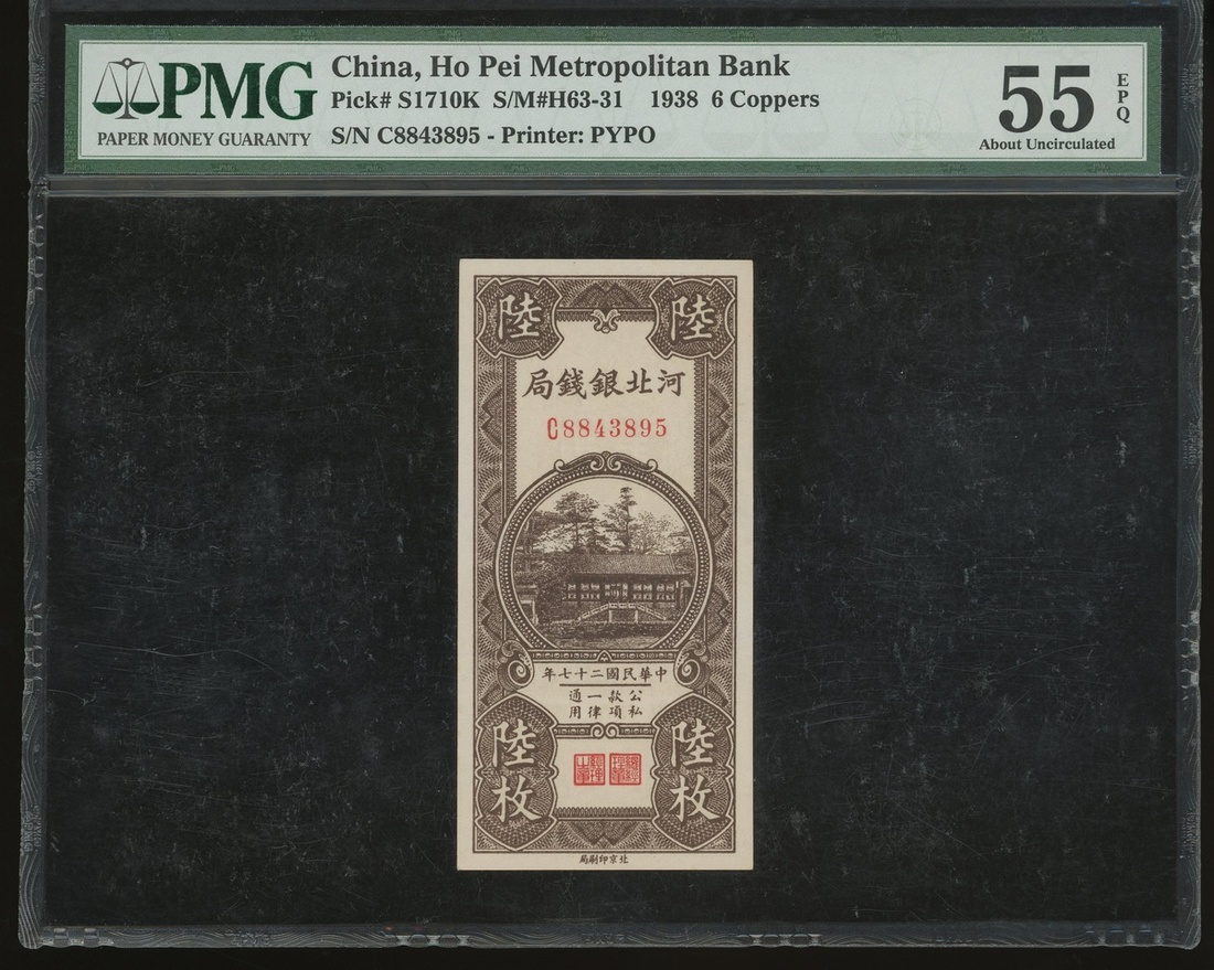 Ho Pei Metropolitan Bank, 6 coppers, Year 27(1938), serial number C8843895, (Pick S1710K), PMG 55EPQ About Uncirculated.