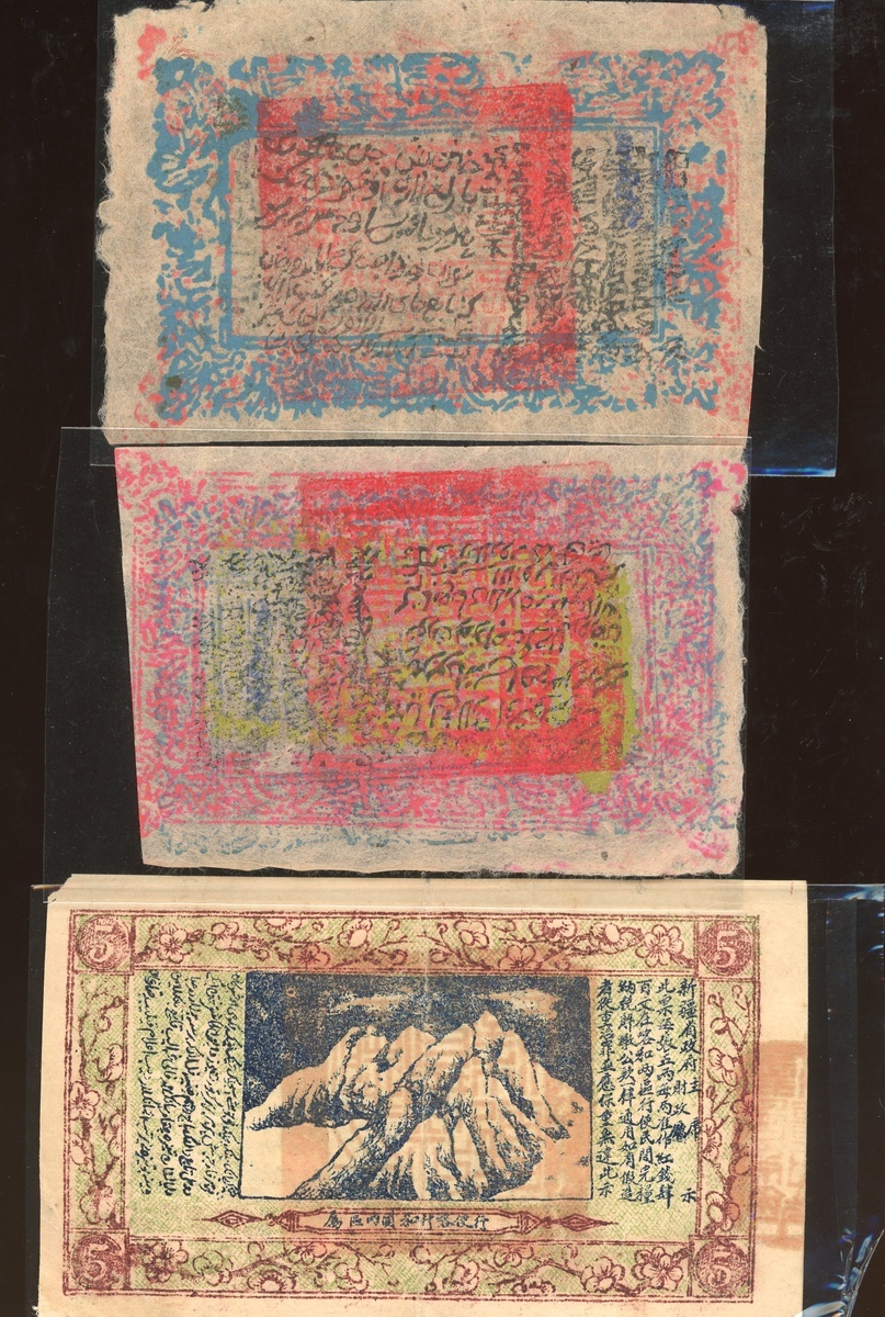 Sinkiang Province, Khotan Administration Government Head Public Office and Tibet, a group of 4x banknotes, consists of Sinkiang 5 teal, Year 21(1932), Khotan, a pair of 3 teals, Year 24(1935), and Tibet, 100 Tam Srang, serial number 08029, (Pick S1780, S1737 and 12), about fine to fine (4)