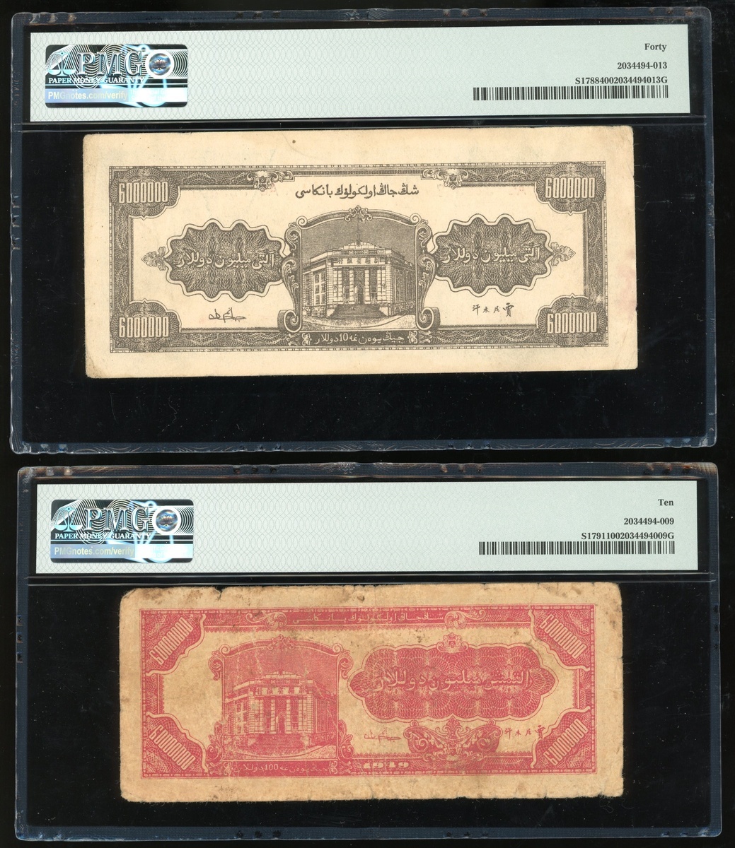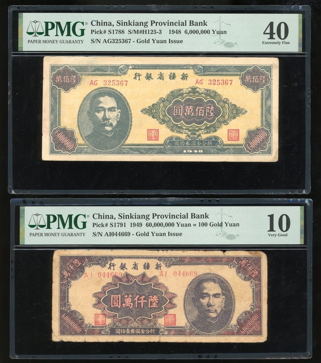 Sinkiang Provincial Bank, a pair of gold yuan issue, 6,000,000 yuan, 1948, and 60,000,000 yuan, 1949, serial numbers AG325367 and AI044669, (Pick S1988 and S1791), graded PMG 40 and 10 respectively (2).