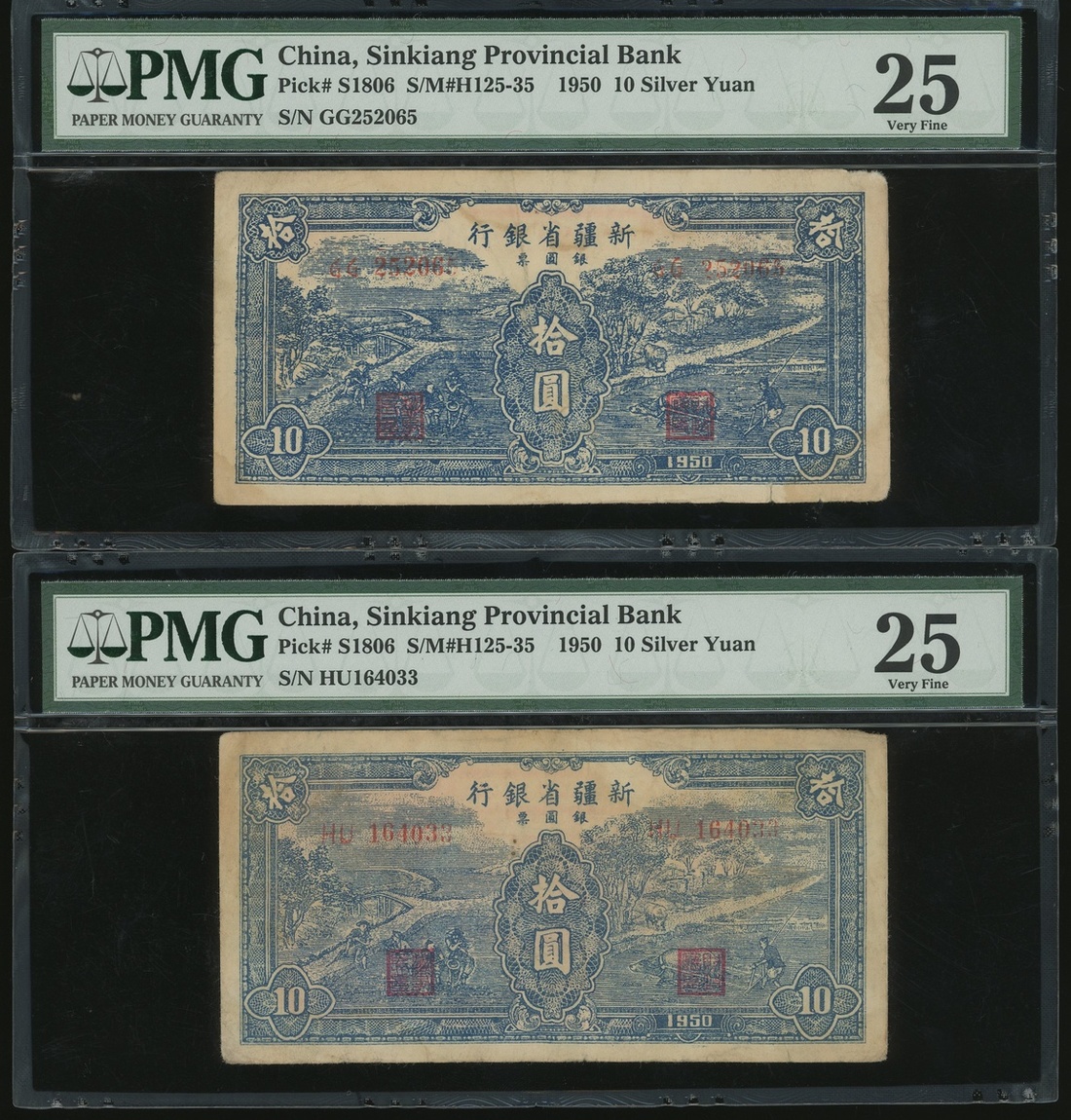 Sinkiang Provincial Bank, a pair of 10 silver yuan, 1950, serial numbers GG252065 and HU164033, (Pick S1806), both graded PMG 25 Very Fine (2).
