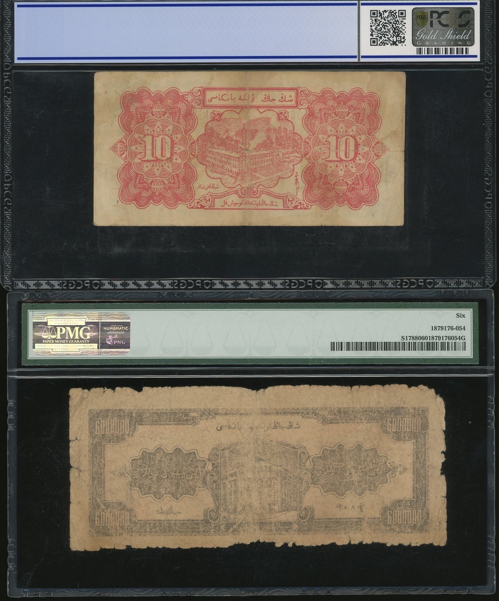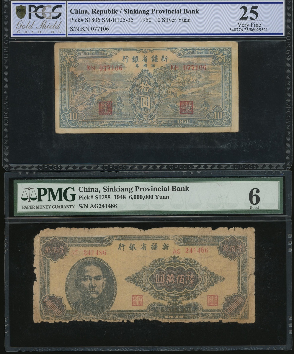 新疆省銀行:1950年銀圓券10元1948年金圓券六佰萬元,編號KN 077106及AG241486,分別PCGS Gold Shield 25及PMG 6(2)