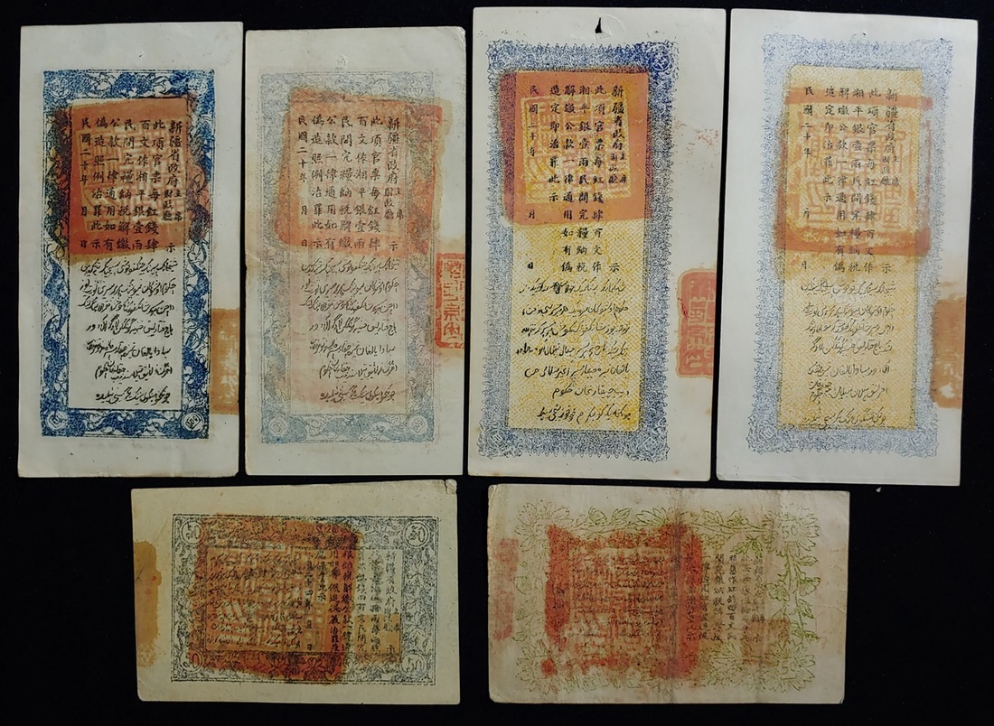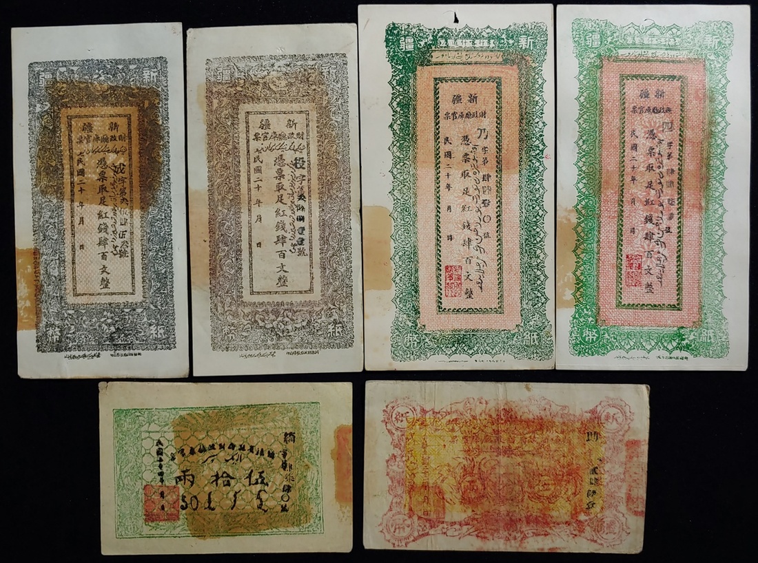 1930年代新疆財政部鈔票一組6枚,400文每版別2枚,50兩每版別1枚,50兩AVF,400文大致AEF,品相不俗 (6)