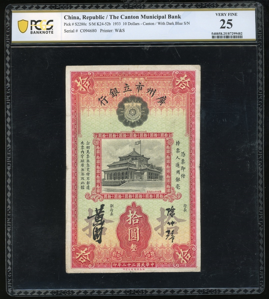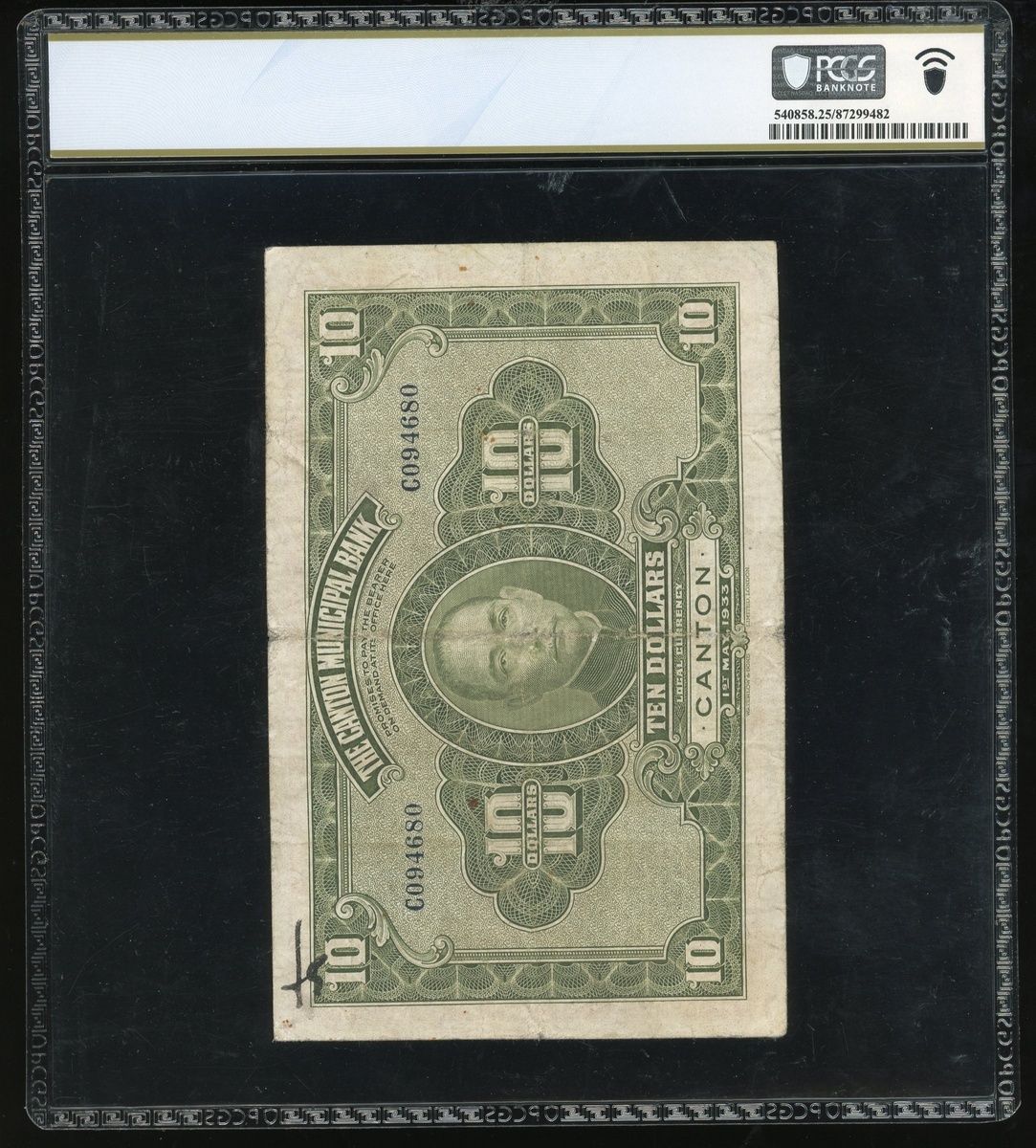 The Canton Muncipal Bank, a pair of 10 cents, Year 17(1928) and $10, Canton, Year 22(1933), and The Kwangtung Provincial Bank, $1, remainder, Hainan Island, Year 29(1940), serial numbers D0670561, C094680 and 1423411, (Pick S2253b, S2280c and S2449r), graded PCGS Gold Shield Grading 25, PCGS Banknote 25 and PCGS Gold Shield Grading 64 UNC Details (Stain) (3).
