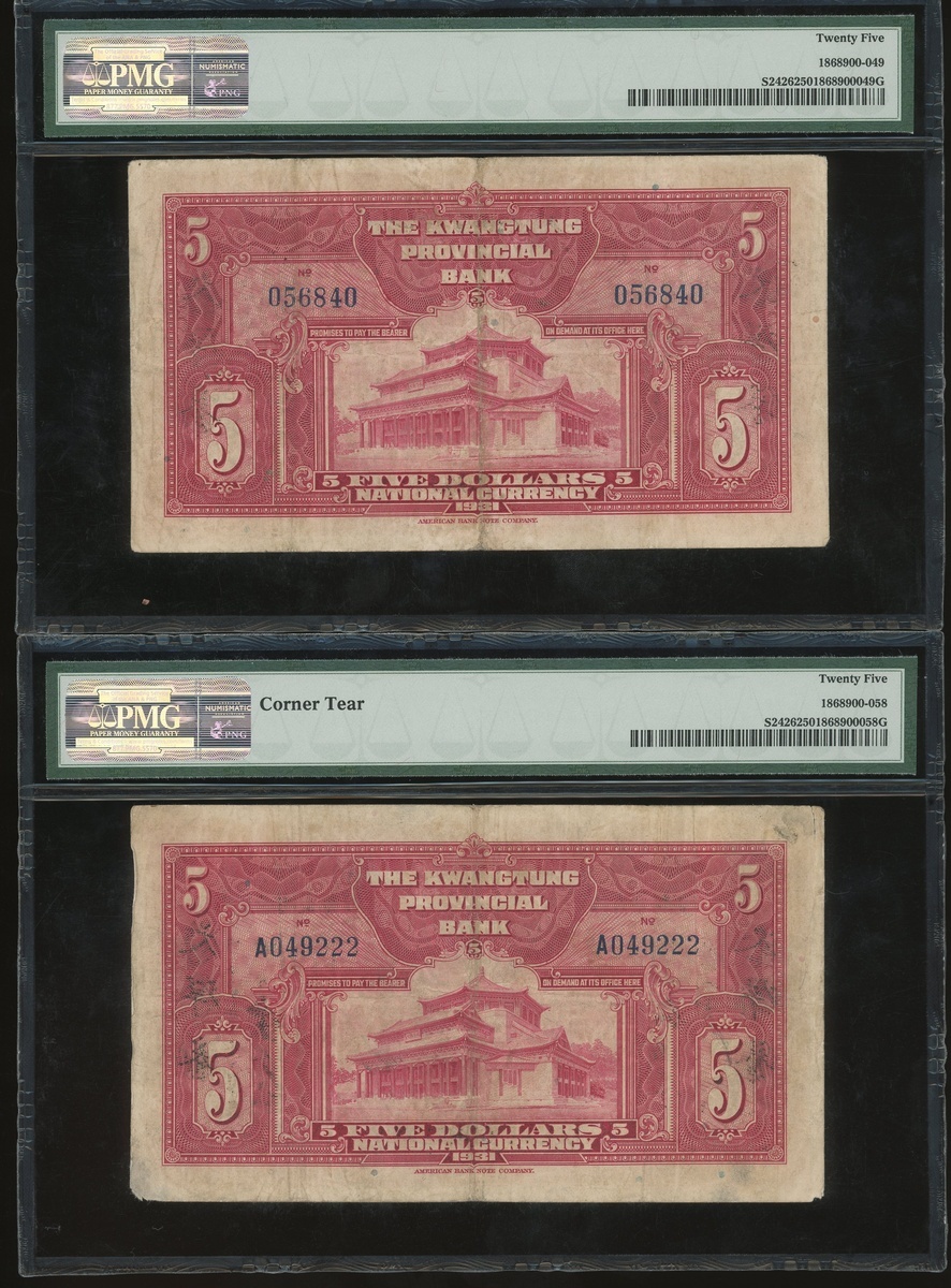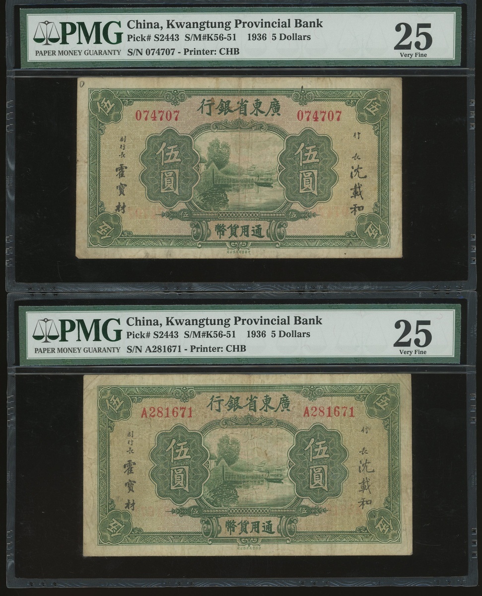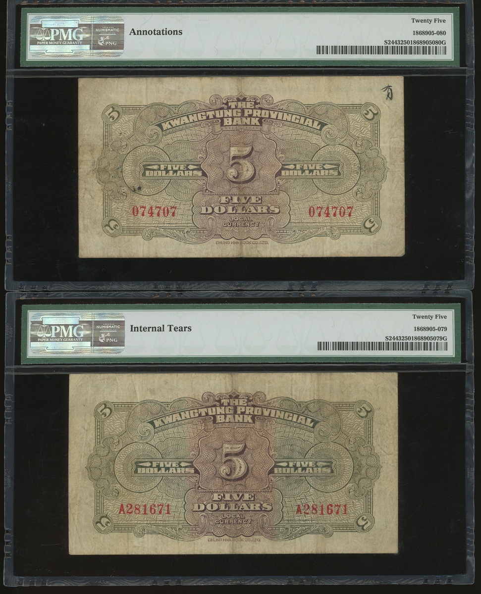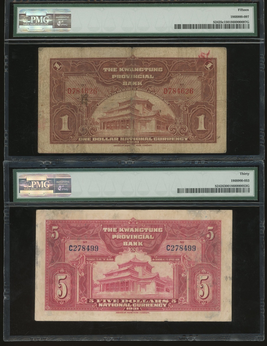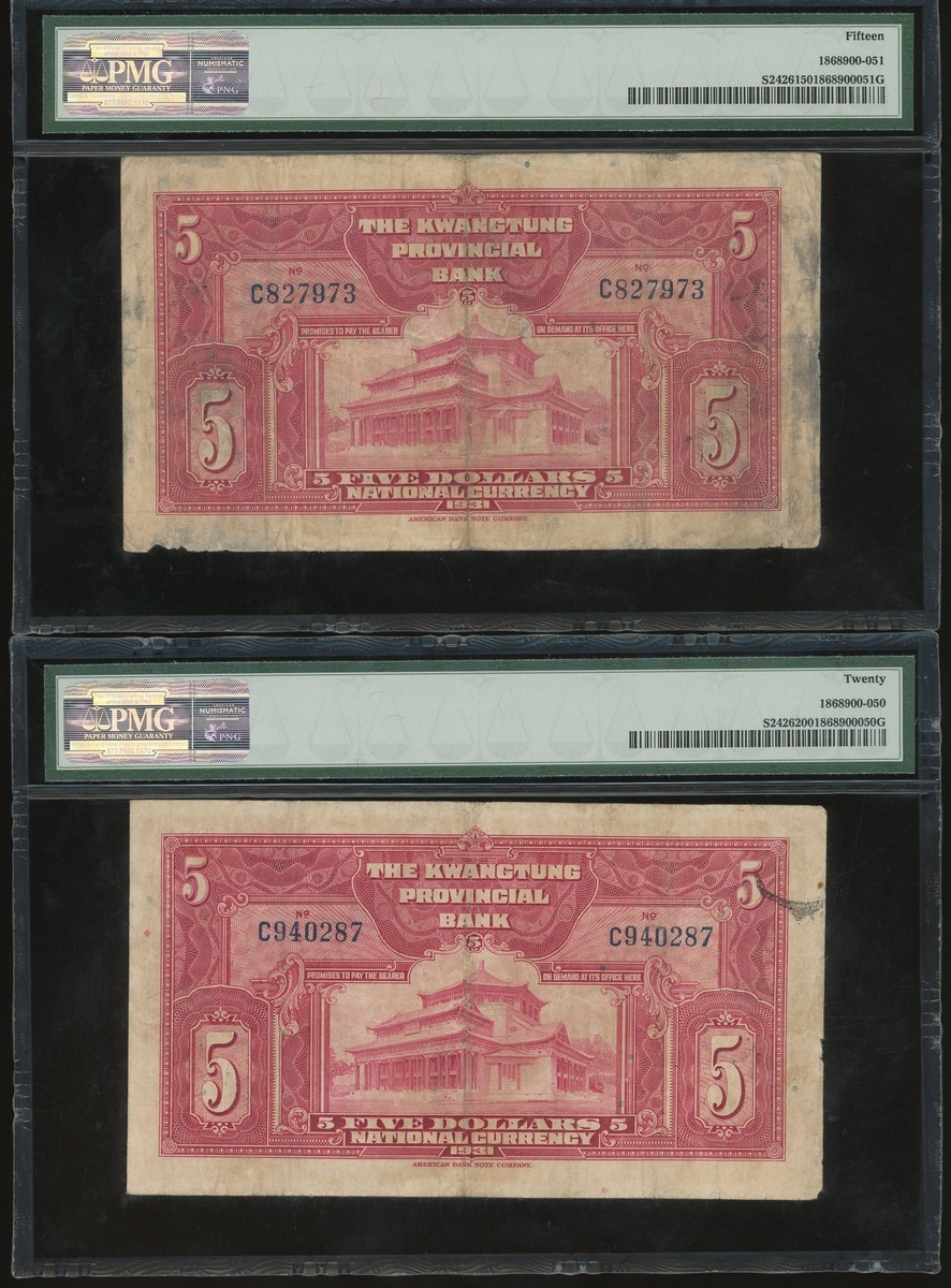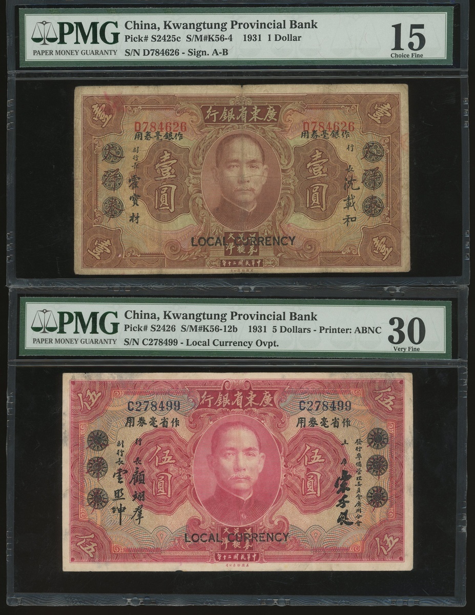 Kwangtung Provincial Bank, a group of 17x notes, consists of 10 cents(4), 20 cents, 50 cents, $1, $5(9) and $10, (S2425c-S2443), all in PMG holder, PMG 15 to 40EPQ (17).
