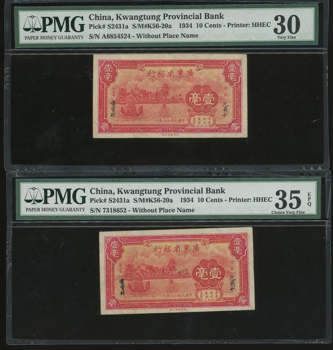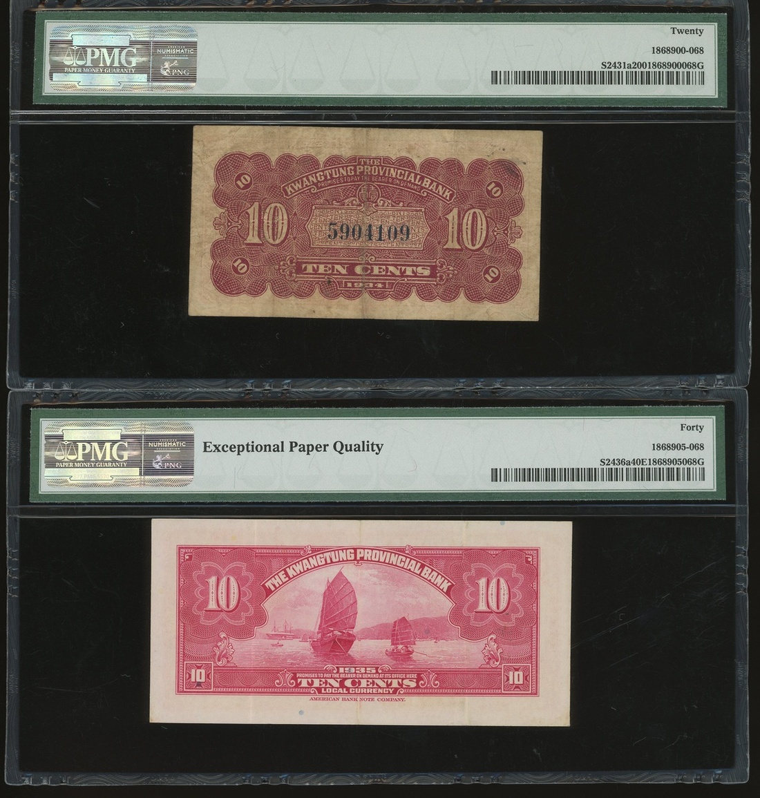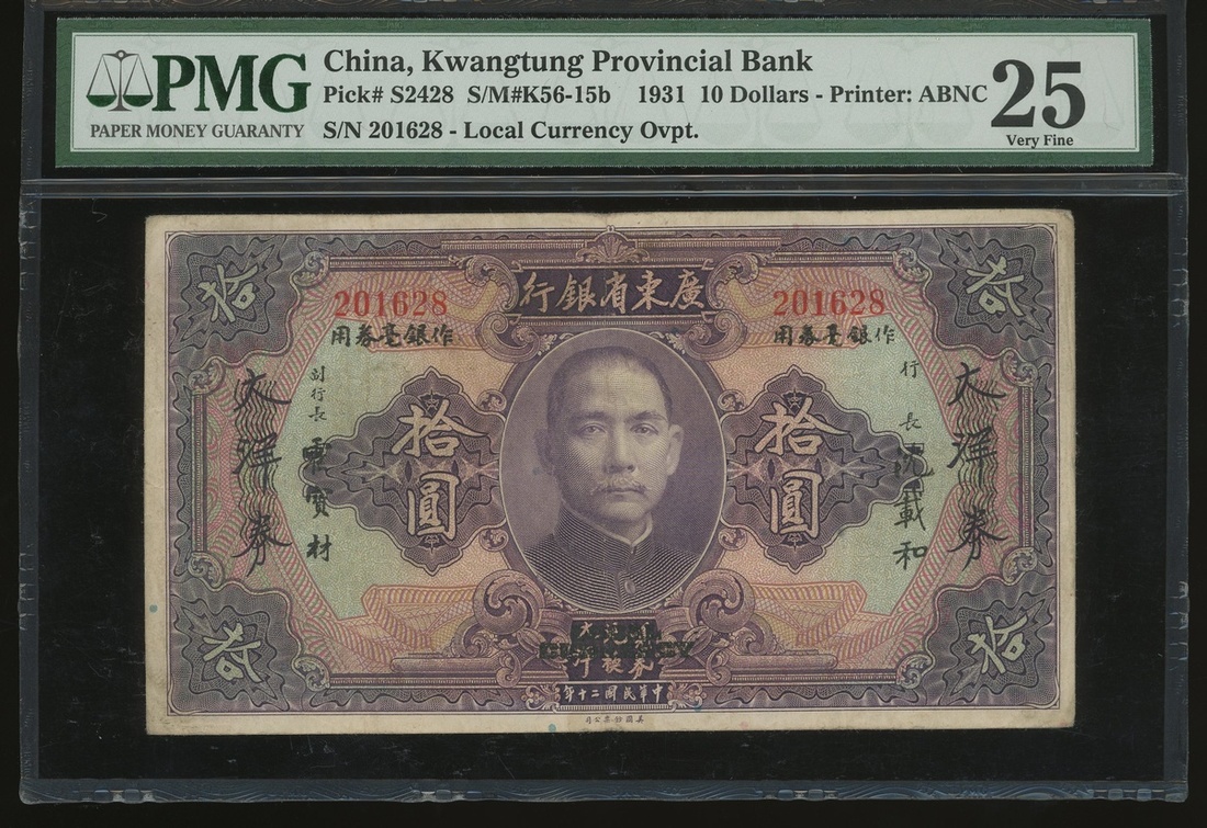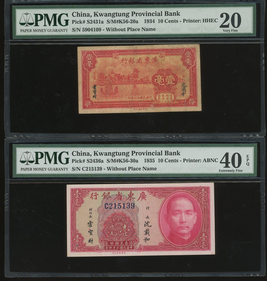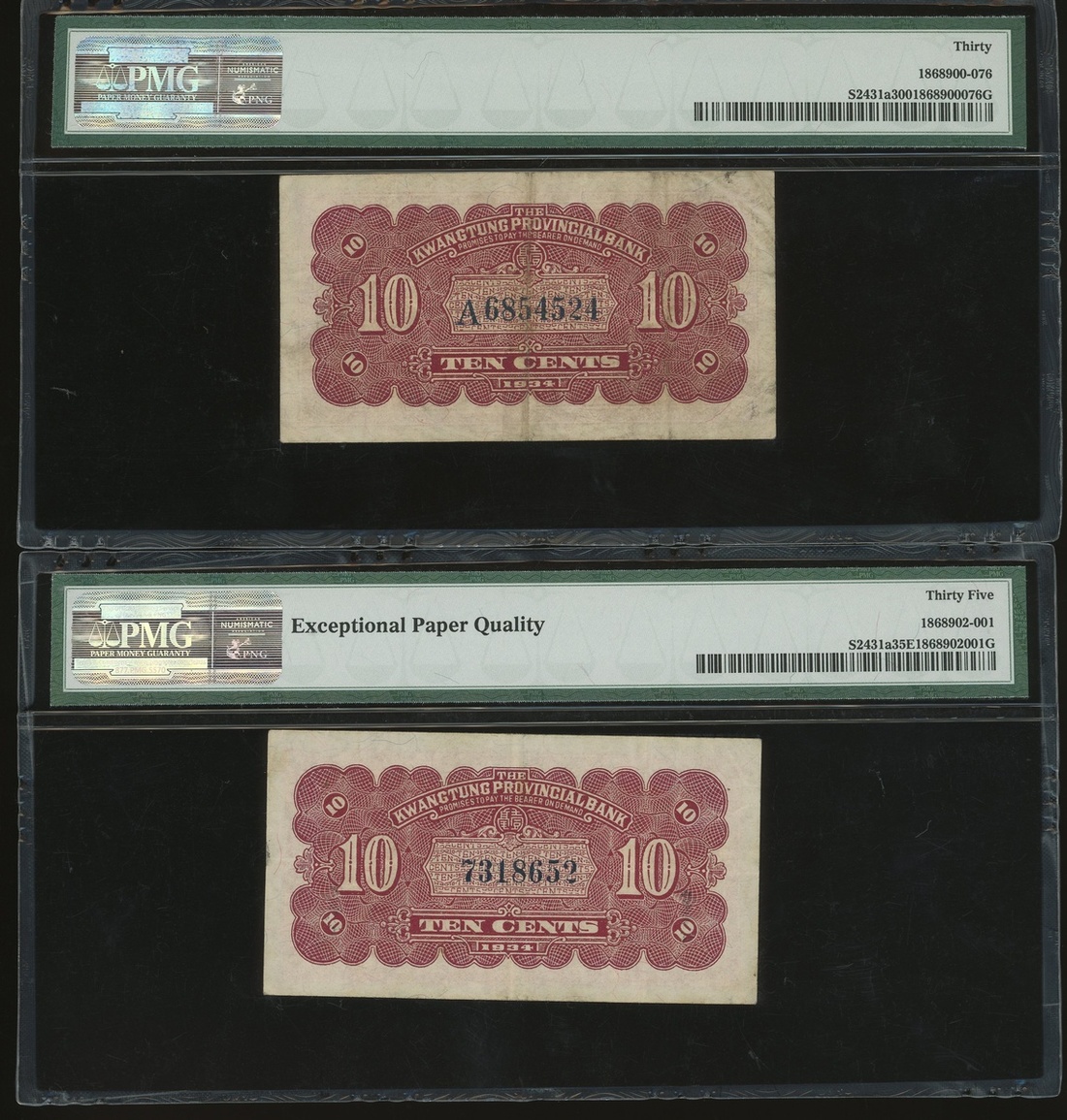 Kwangtung Provincial Bank, a group of 17x notes, consists of 10 cents(4), 20 cents, 50 cents, $1, $5(9) and $10, (S2425c-S2443), all in PMG holder, PMG 15 to 40EPQ (17).