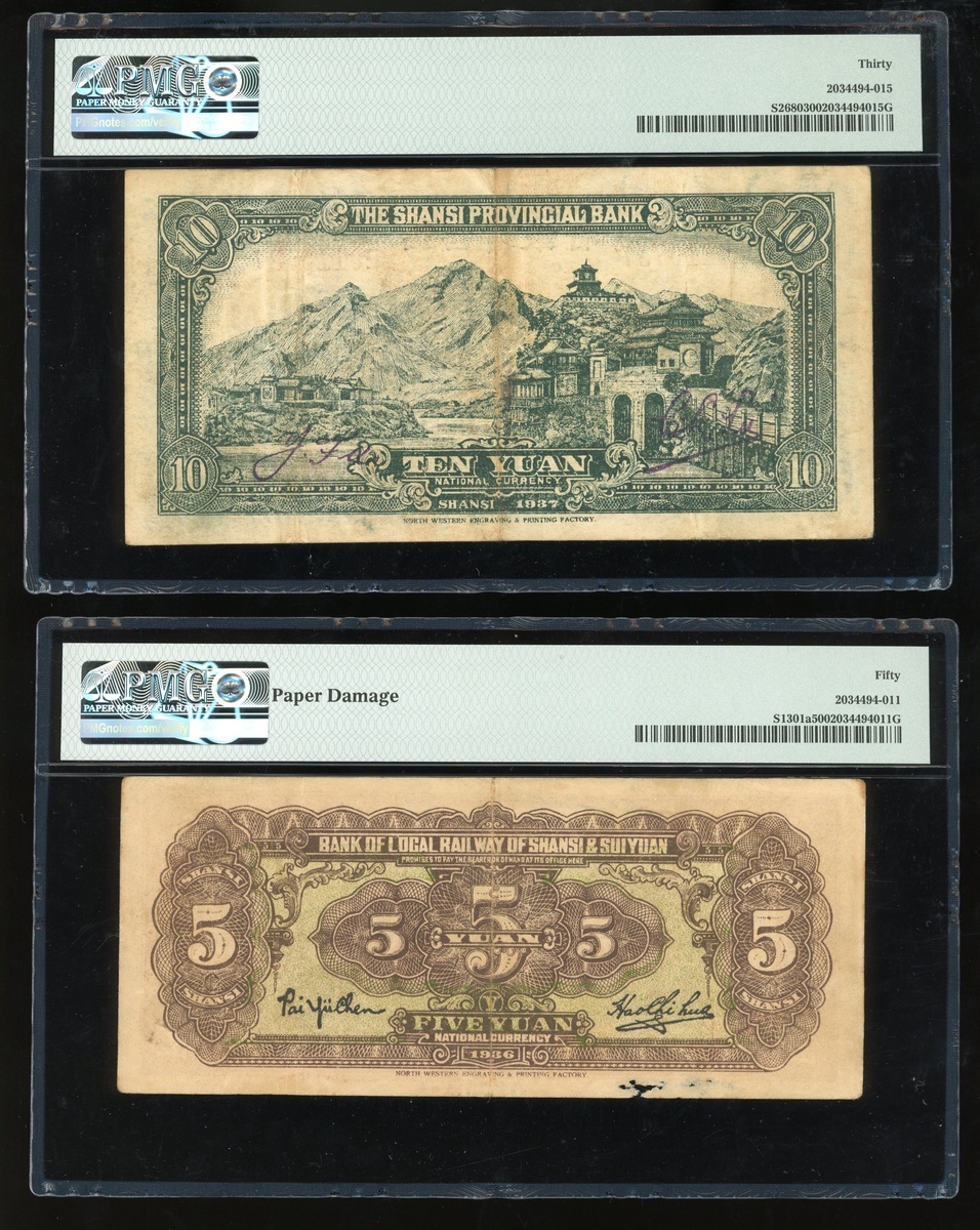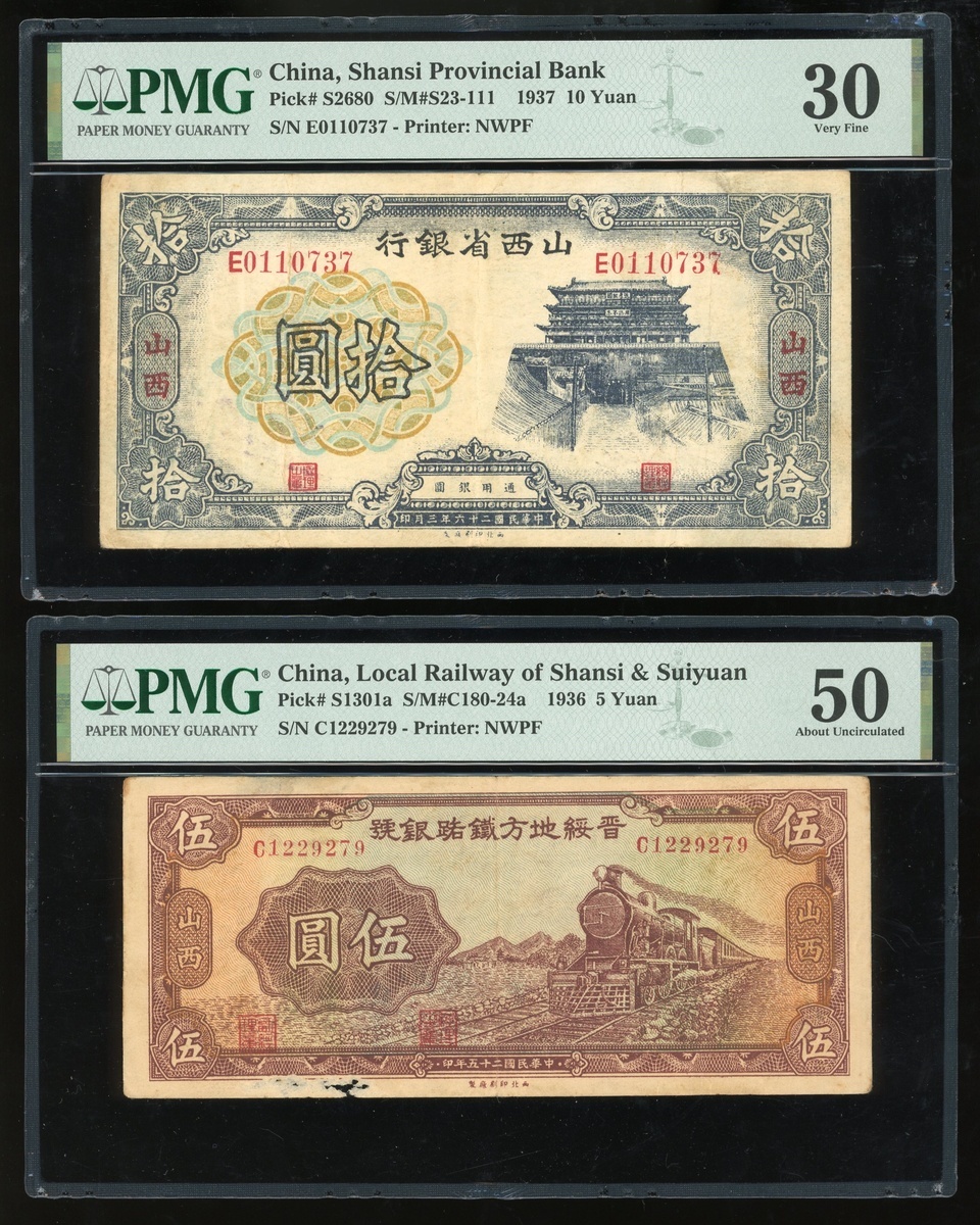 Shansi Provincial Bank, 10 yuan, Year 26(1937), and Local Railway of Chansi & Suiyuan, 5 yuan, Year 25(1936), serial numbers E0110737 and C1229279, (Pick S2680 and S1301a), graded PMG 30 and 50(Paper Damage) respectively (2).