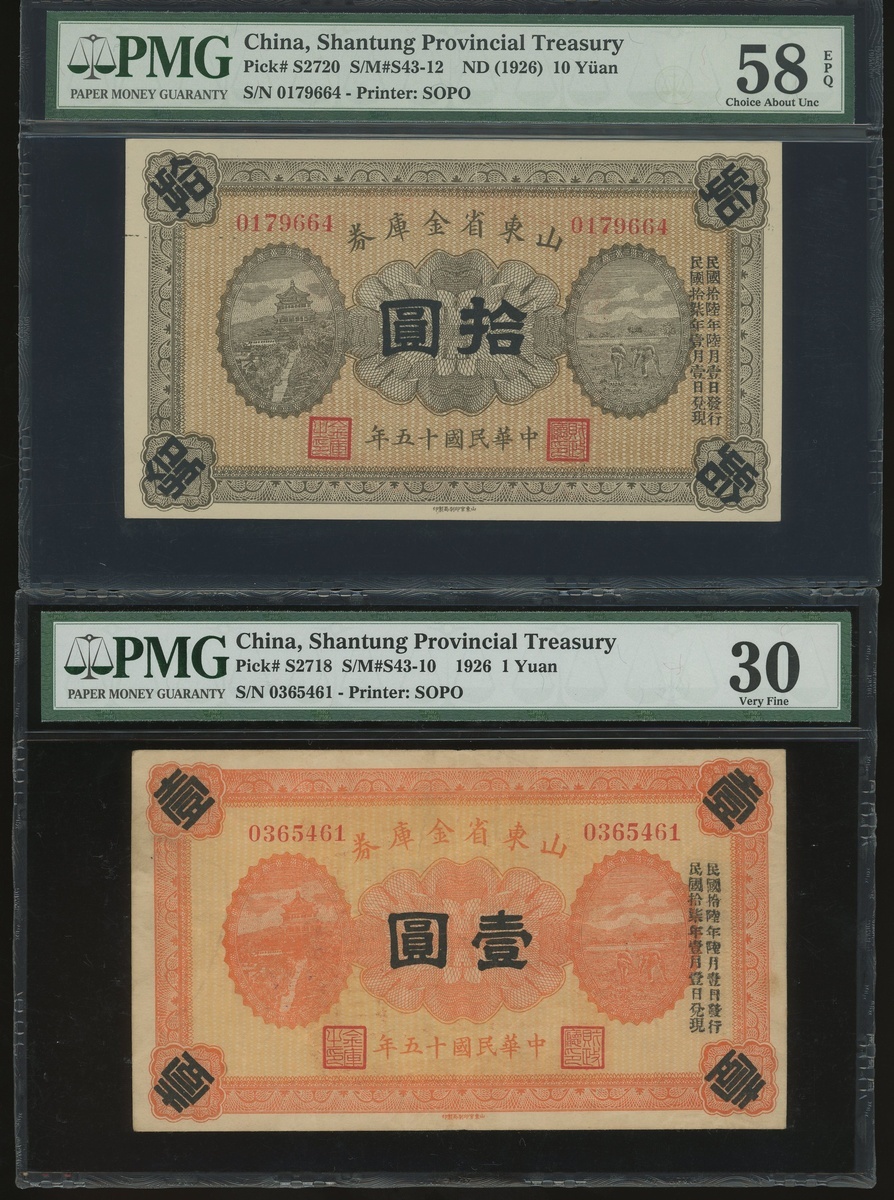 Shantung Provincial Treasury, a pair of 1 yuan and 10 yuan, Year 15(1926), serial numbers 0365461 and 0179664, (Pick S2718 and S2720), graded PMG 30 and 58EPQ respectively (2).