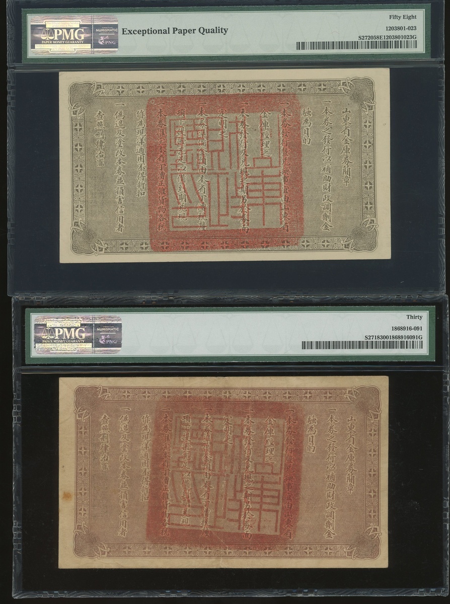 1926年山東省金庫券1元、10元一組兩枚,編號0365461及0179664,分別PMG 30及58EPQ(2)