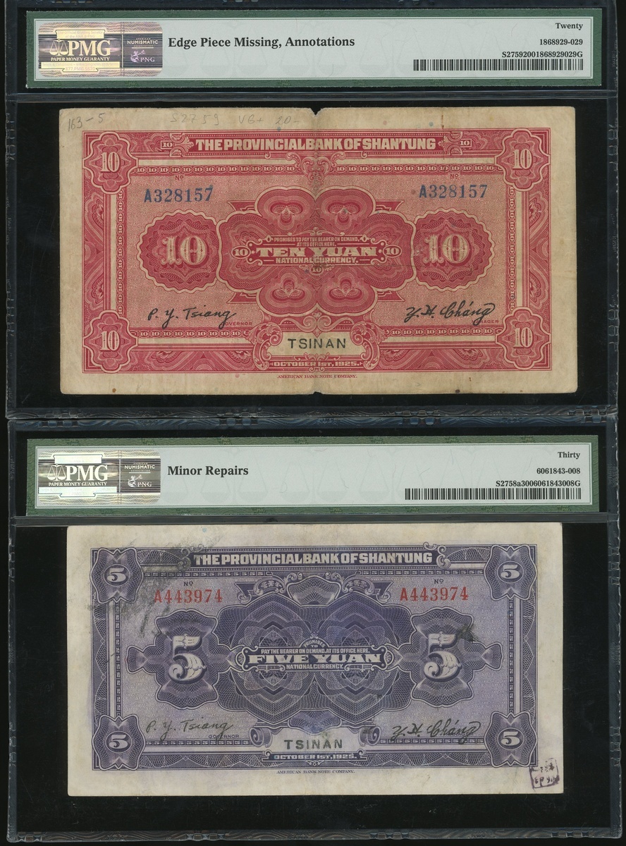 Provinvial Bank of Shantung, a group of 5x notes, 1 yuan (2), 5 yuan (2) and 10 yuan, (Pick S2751a, S2757a, S2752a, S2758a and S2759), all in PMG holder, PMG 20 to 30 (5).