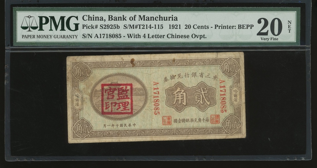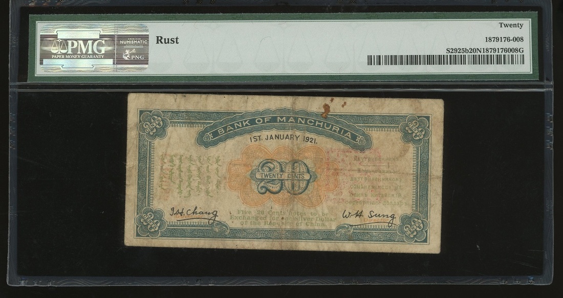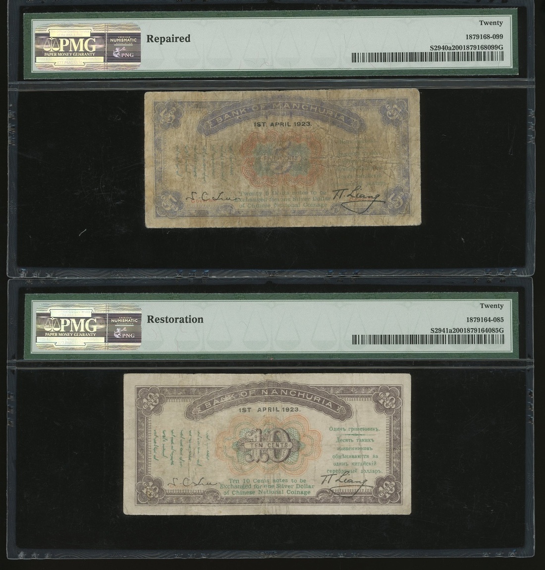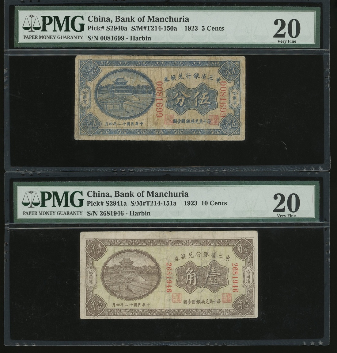 Bank of Manchuria, a group of 3x notes, consists of 5 cents, 10 cents, Year 12(1923) and 20 cents, Year 10(1921), Harbin, serial numbers 0081699, 2681946 and A1718085, (Pick S2940a, S2941a and S2925b), graded PMG 20(Repaired), 20(Restoration) and 20 NET (Rust) respectively (3).