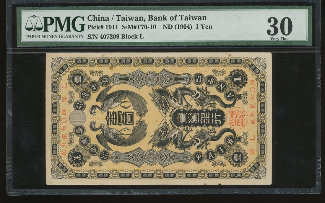 1904年台灣銀行券龍鳳金1元,編號407299 L,PMG 30,有鏽及針孔