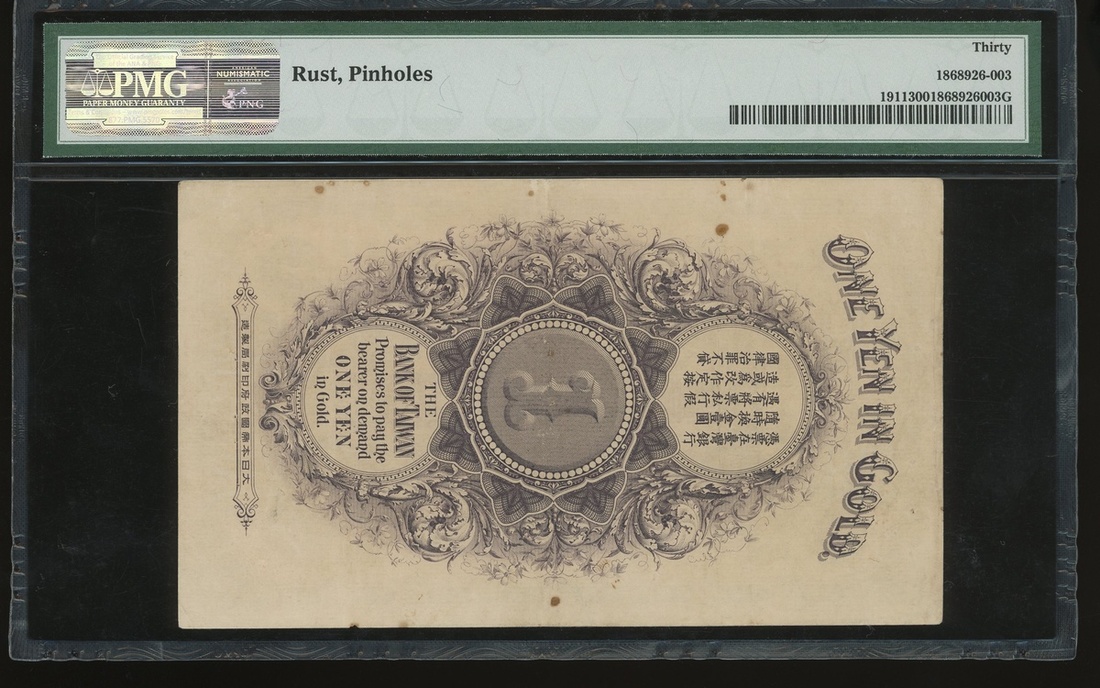 Bank of Taiwan, 1 gold yen, ND (1904), serial number 407299 L, (Pick 1911), PMG 30 Very Fine (Rust, Pinholes).