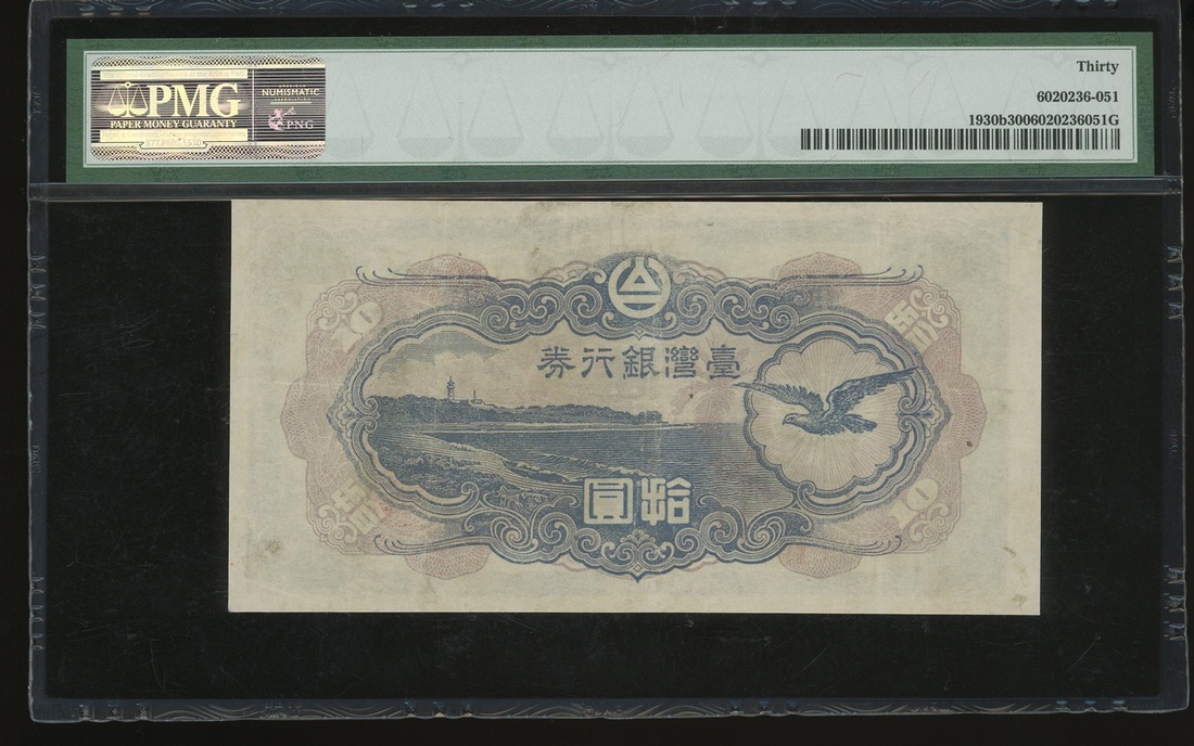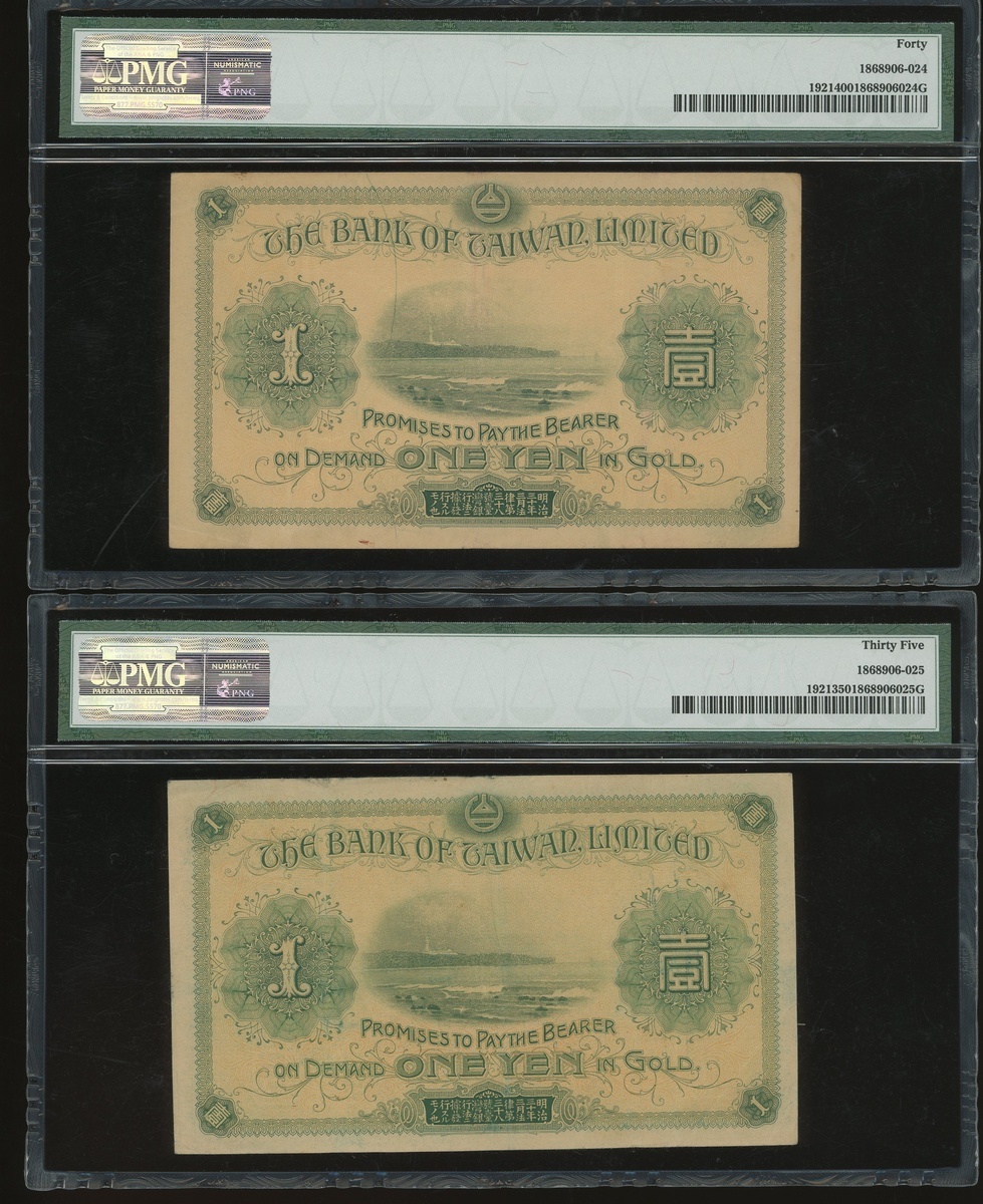 Bank of Taiwan Ltd., a group of 4x notes, consists of 3x 1 yen, ND (1904 and 1915), 10 yen, ND (1945), serial numbers 845672N, 391133 [47], 91133 [47] and [19], (Pick 1911, 1921 and 1930b), graded PCGS Gold Shield Grading 6 (Tear Repaired), PMG 40, 35 and 30 respectively