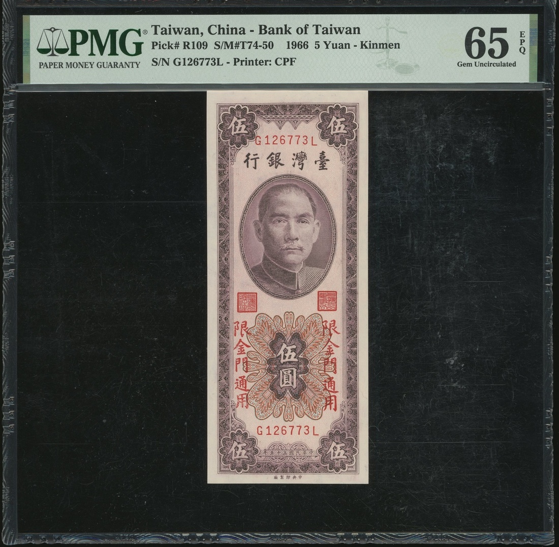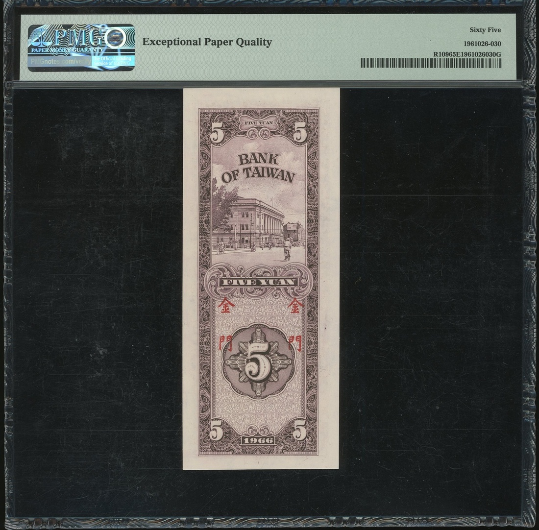 Bank of Taiwan, 5 Yuan, Kinmen, 1966, serial number G126773L, (Pick R109), PMG 65EPQ Gem Uncirculated