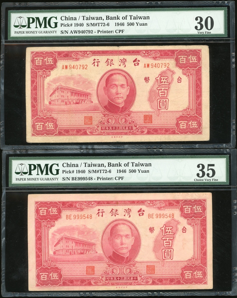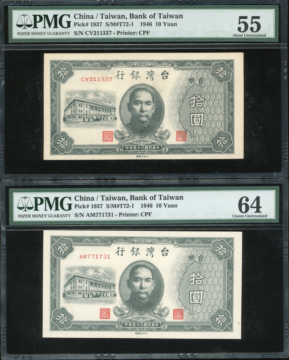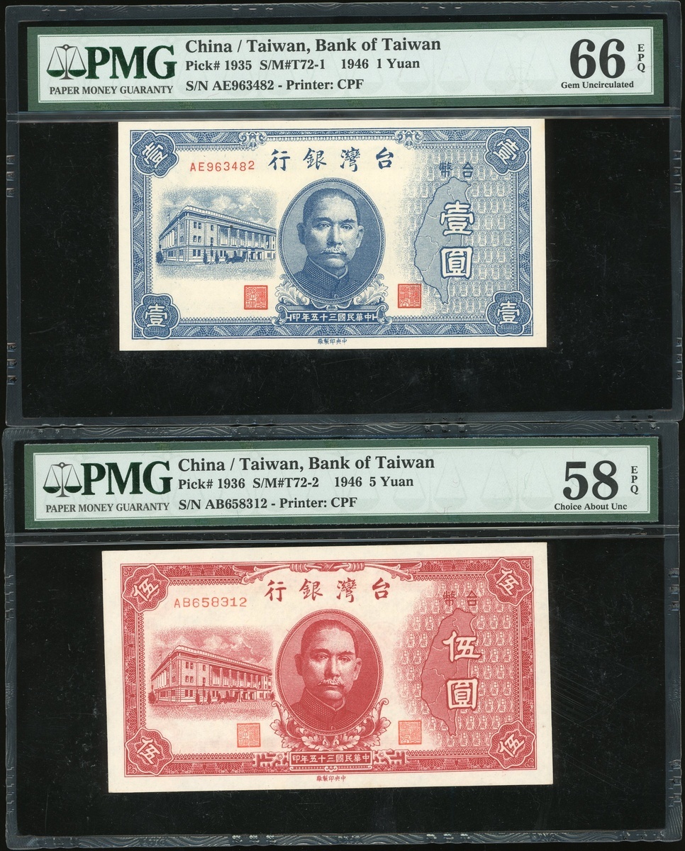 Bank of Taiwan, a group of 7x notes, consists of 1 yuan, 5 yuan, 10 yuan (2), 500 yuan (2), 1946 and 1000 yuan, 1948, (Pick 1935-1937, 1940 and 1942), all in PMG holders, PMG 30 to 66EPQ (7).