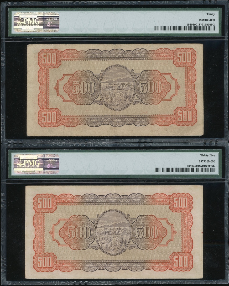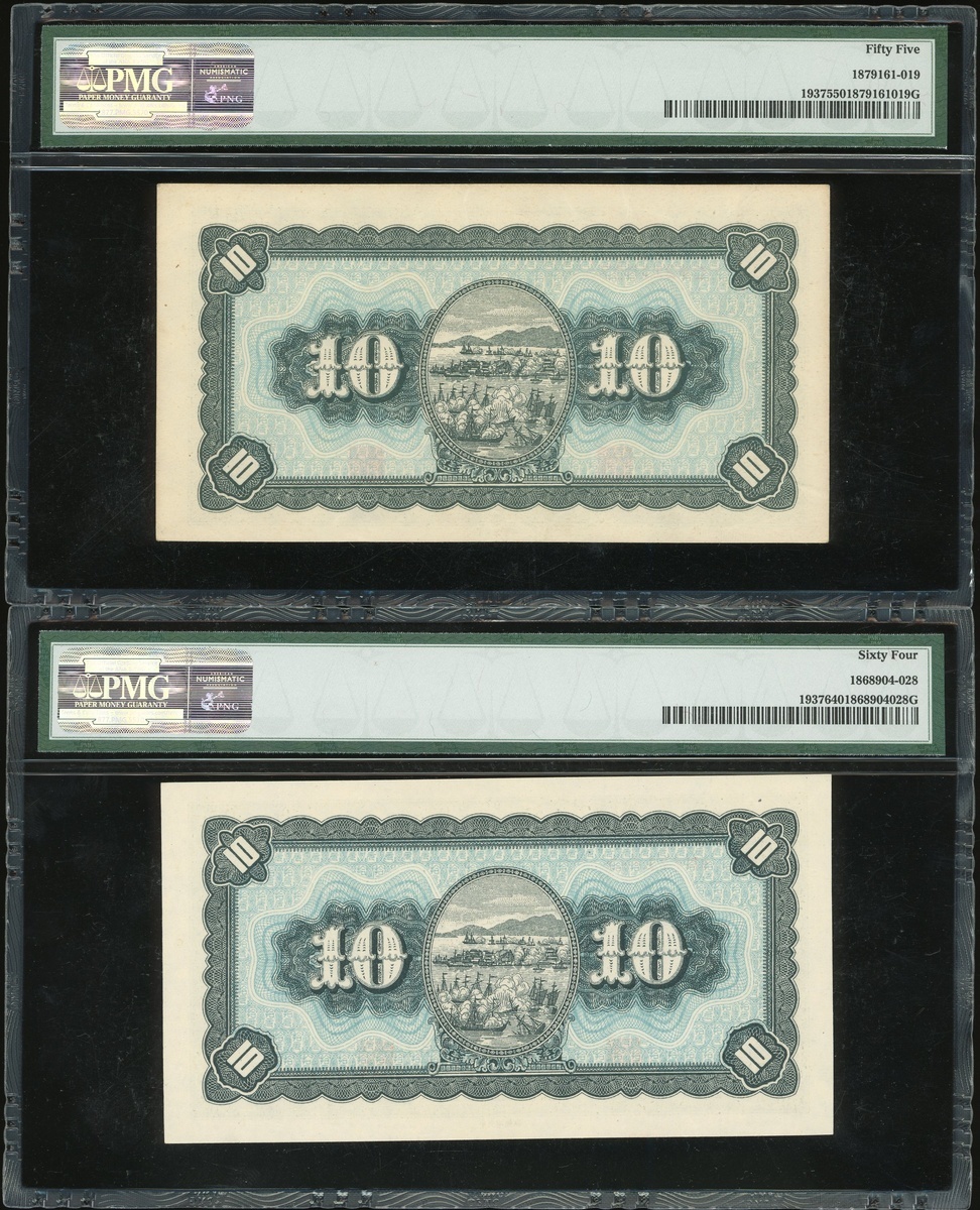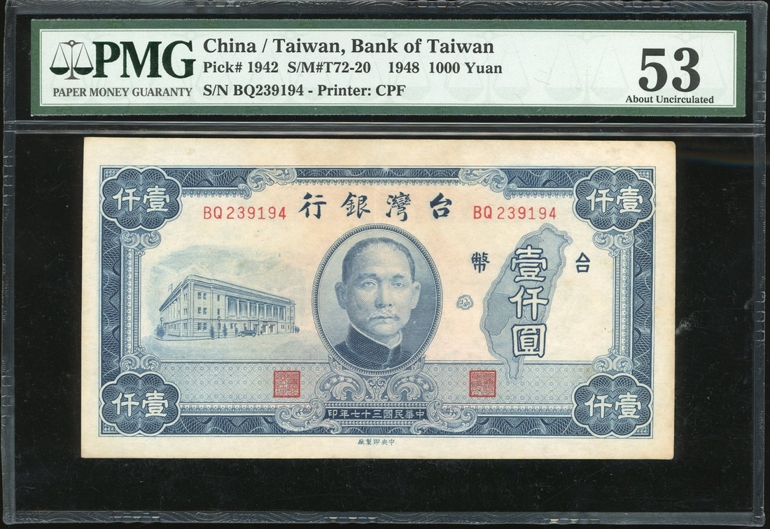 Bank of Taiwan, a group of 7x notes, consists of 1 yuan, 5 yuan, 10 yuan (2), 500 yuan (2), 1946 and 1000 yuan, 1948, (Pick 1935-1937, 1940 and 1942), all in PMG holders, PMG 30 to 66EPQ (7).