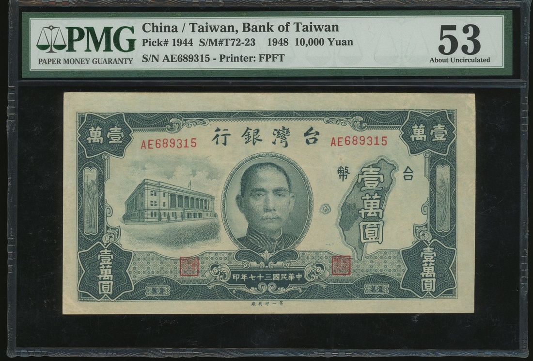 Bank of Taiwan, 10000 yuan, Year 37 (1948), serial number AE689315, (Pick 1944), PMG 53 About Uncirculated.
