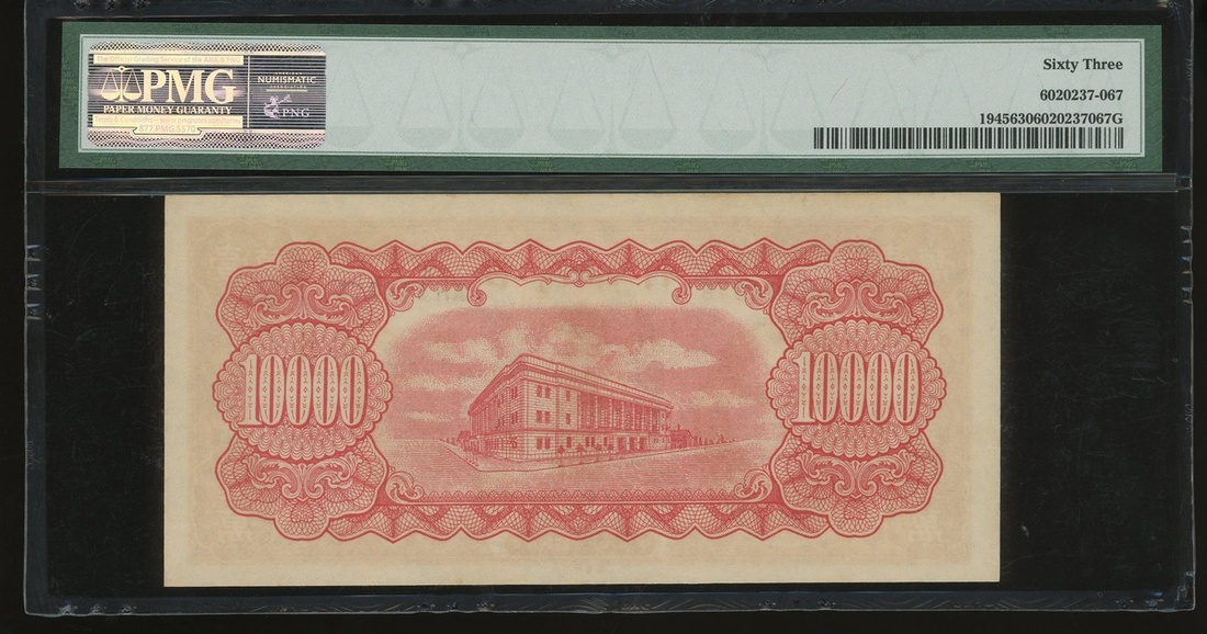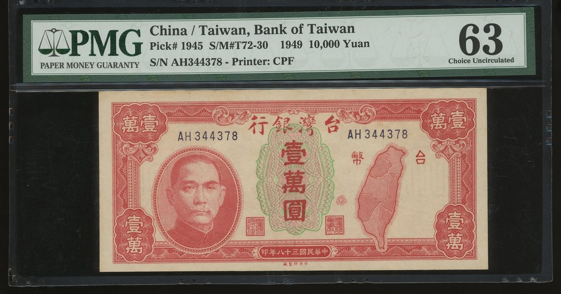 Bank of Taiwan, 10000 yuan, Year 38(1949), serial number AH344378, (Pick 1945), PMG 63 Choice Uncirculated.